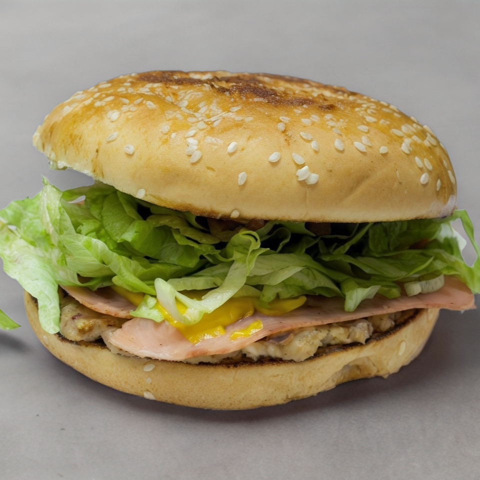 Pierna con jamón, crema, tomate, cebolla y lechuga.