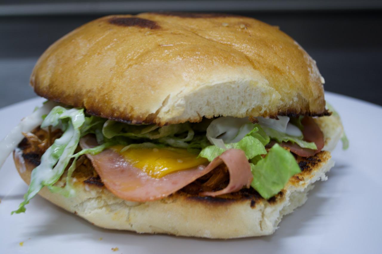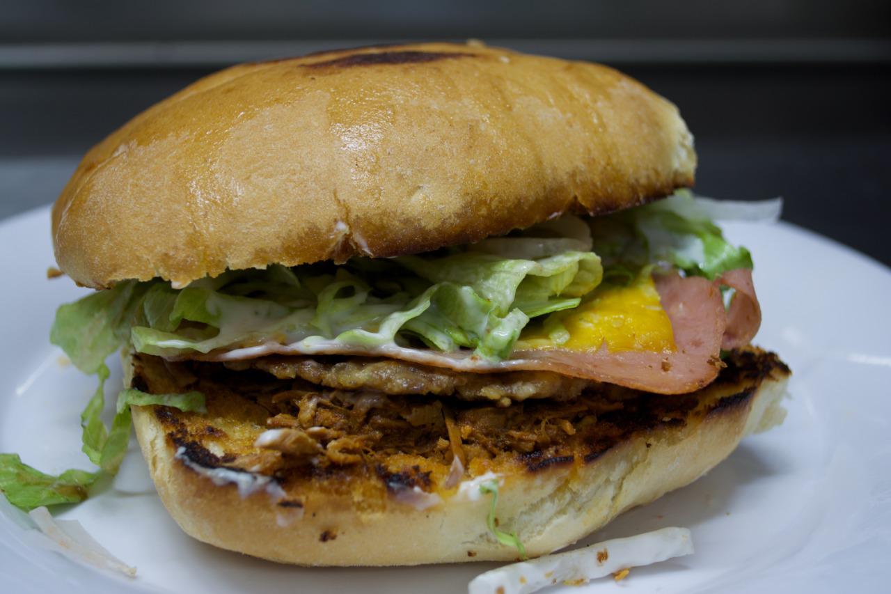 Pierna, jamón queso amarillo, carne de hamburguesa, crema, tomate, cebolla y lechuga.