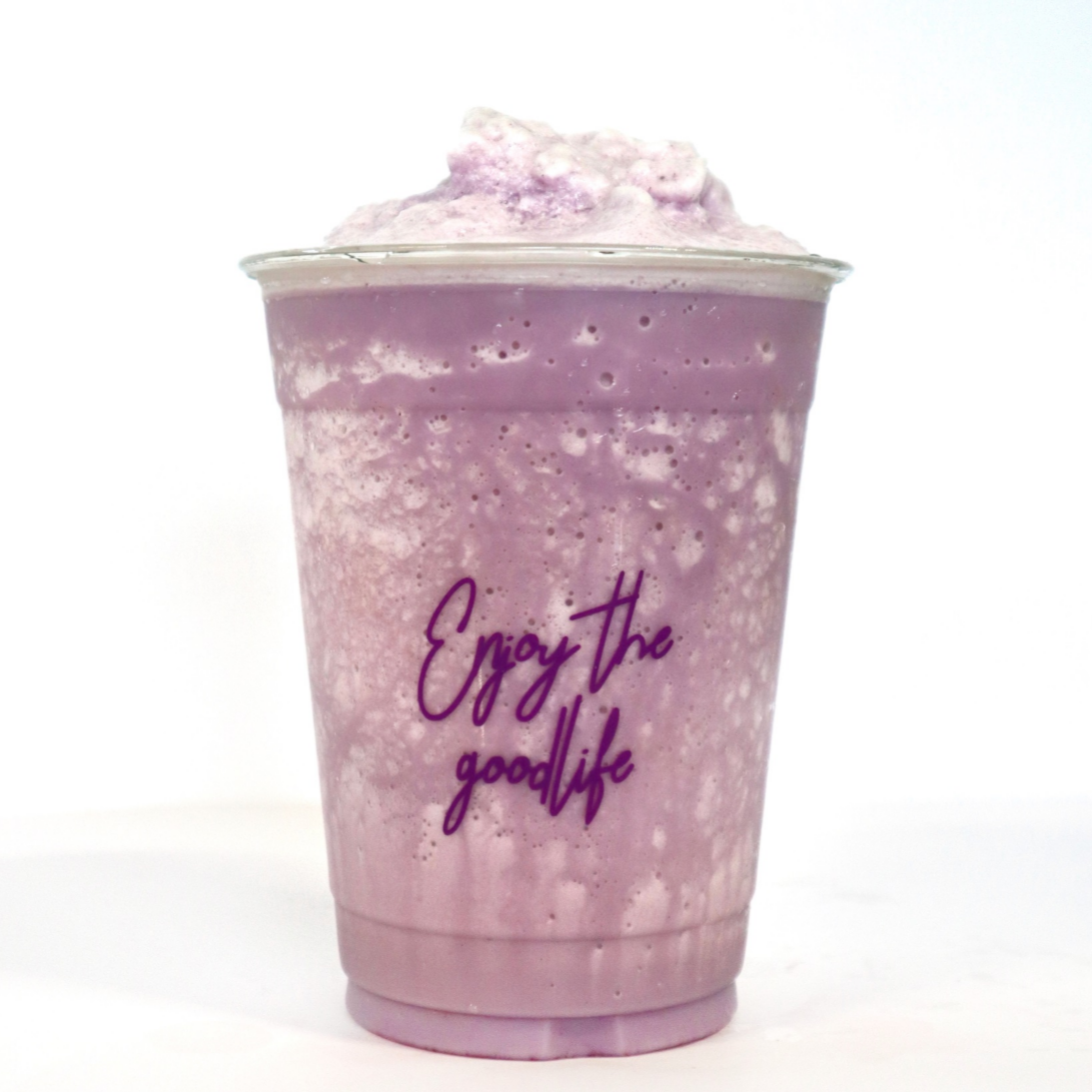 Bebida a base de taro puro orgánico mezclada con leche y hielo frappé.