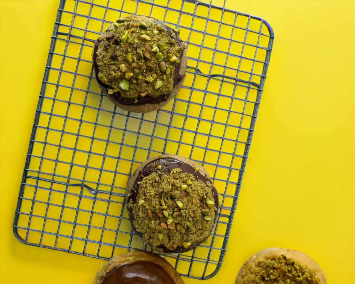 Deliciosa galleta rellena de Kataifi, decorada con chocolate y pistache. Una pieza.