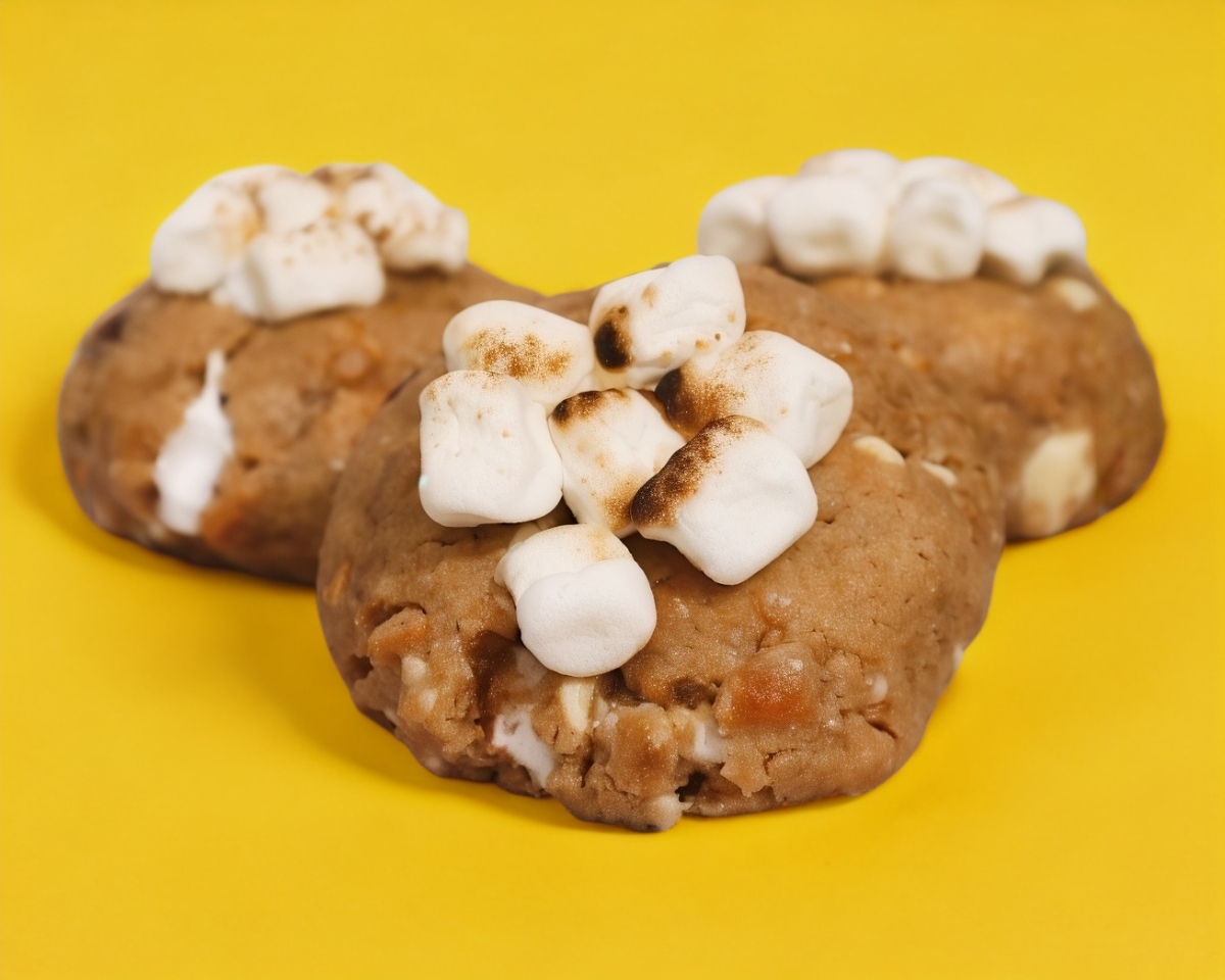 Deliciosa galleta rellena de chispas de chocolate y bombones, coronada también con pequeños malvaviscos flameados.