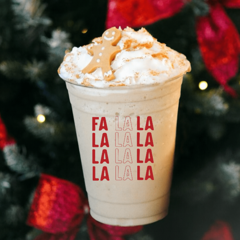 Frappe navideno que combina espresso, leche, hielo y sabor a pan de jengibre, coronado con crema batida, canela y una galleta de jengibre.
