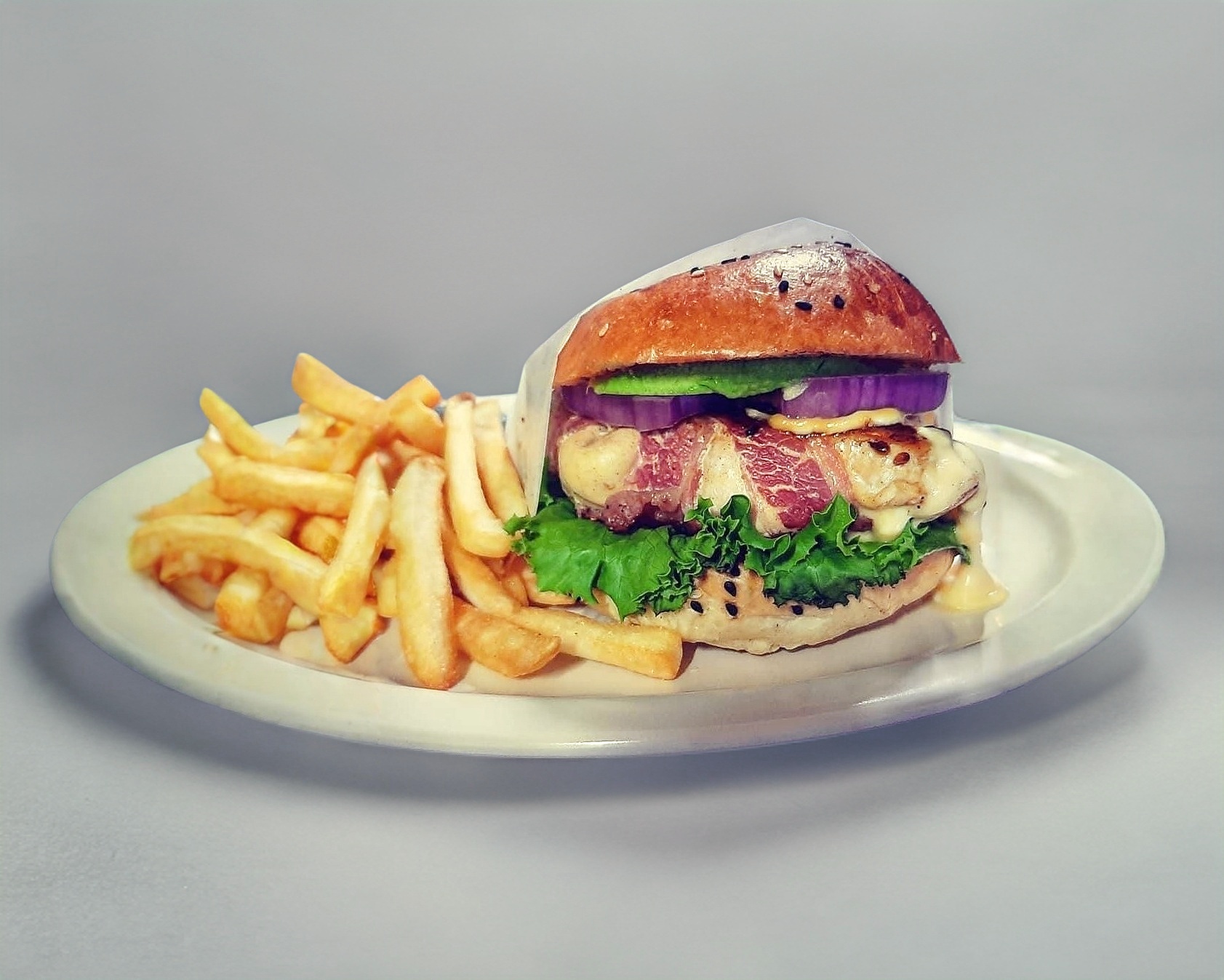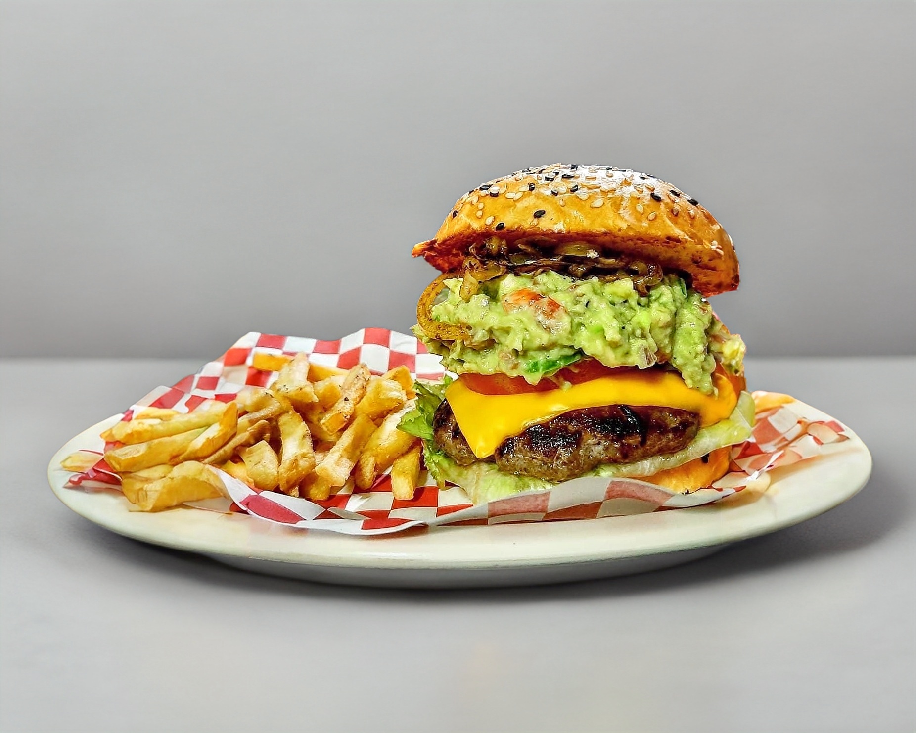 150 grs. de carne de res, guacamole preparado con pico de gall, queso americano y cebolla caramelisada.