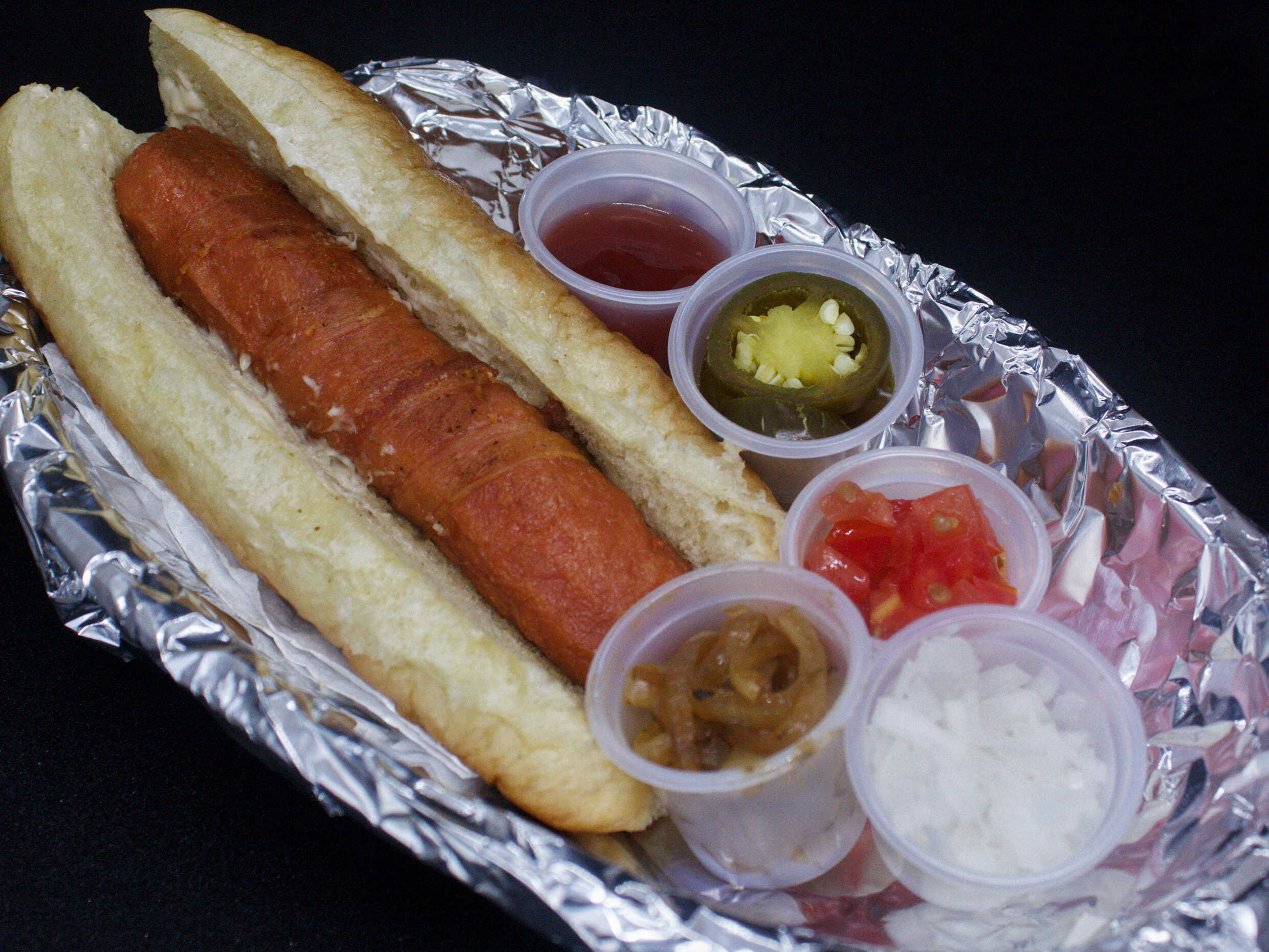 Salchicha, tocino, cebolla y cebolla caramelizada.