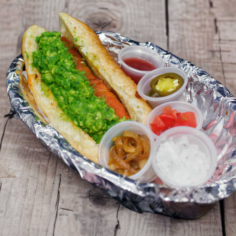 Salchicha ,tocino, guacamole preparado con pico de gallo.