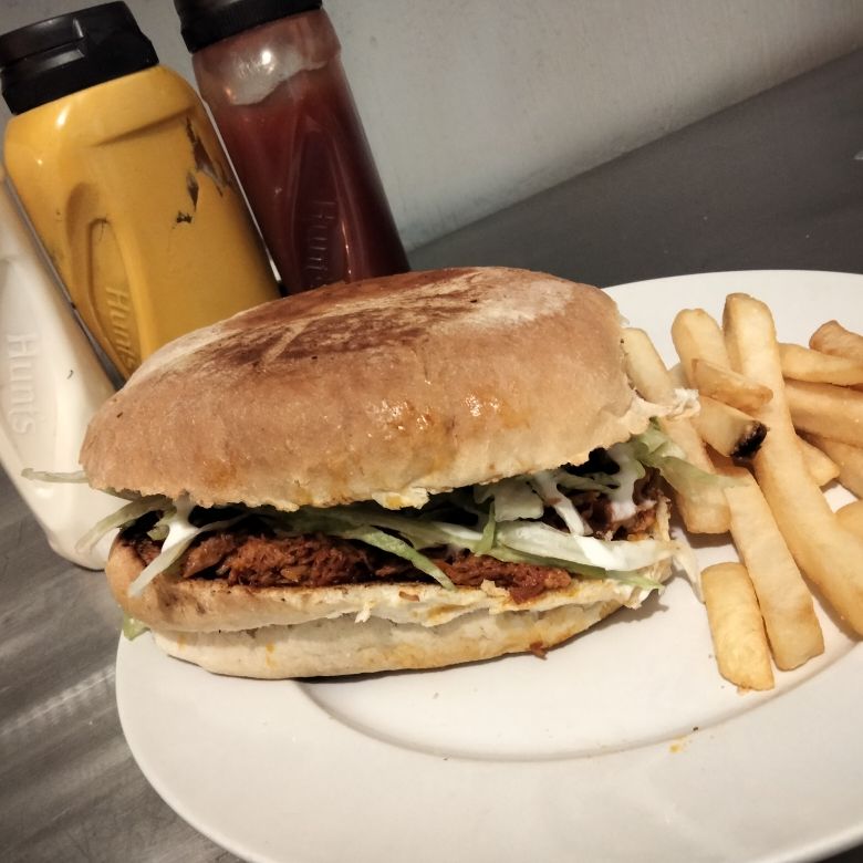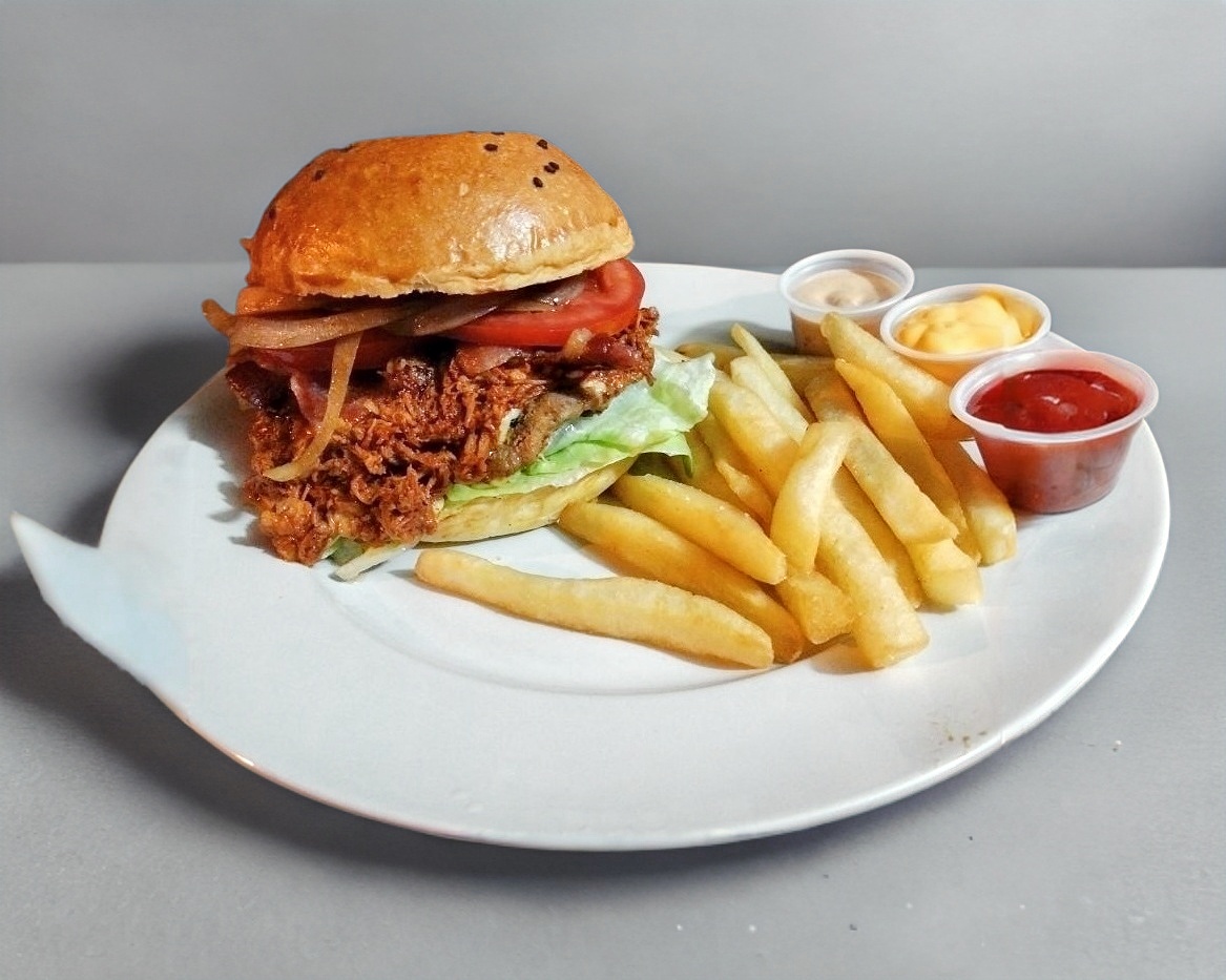 150 grs. de carne de res, queso chihuhua, jamón, piña un toque de salsa teriyaki y cebolla caramelisada.
