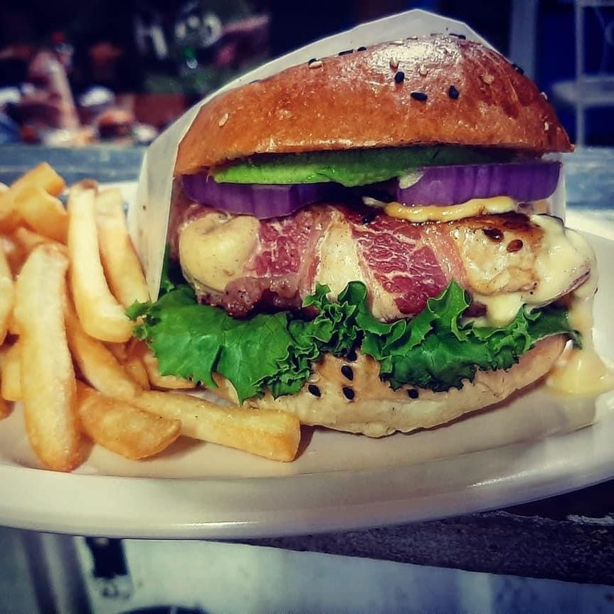 150 grs. de carne de res, guacamole preparado con pico de gall, queso chihuhua, tocino y cebolla caramelisada.