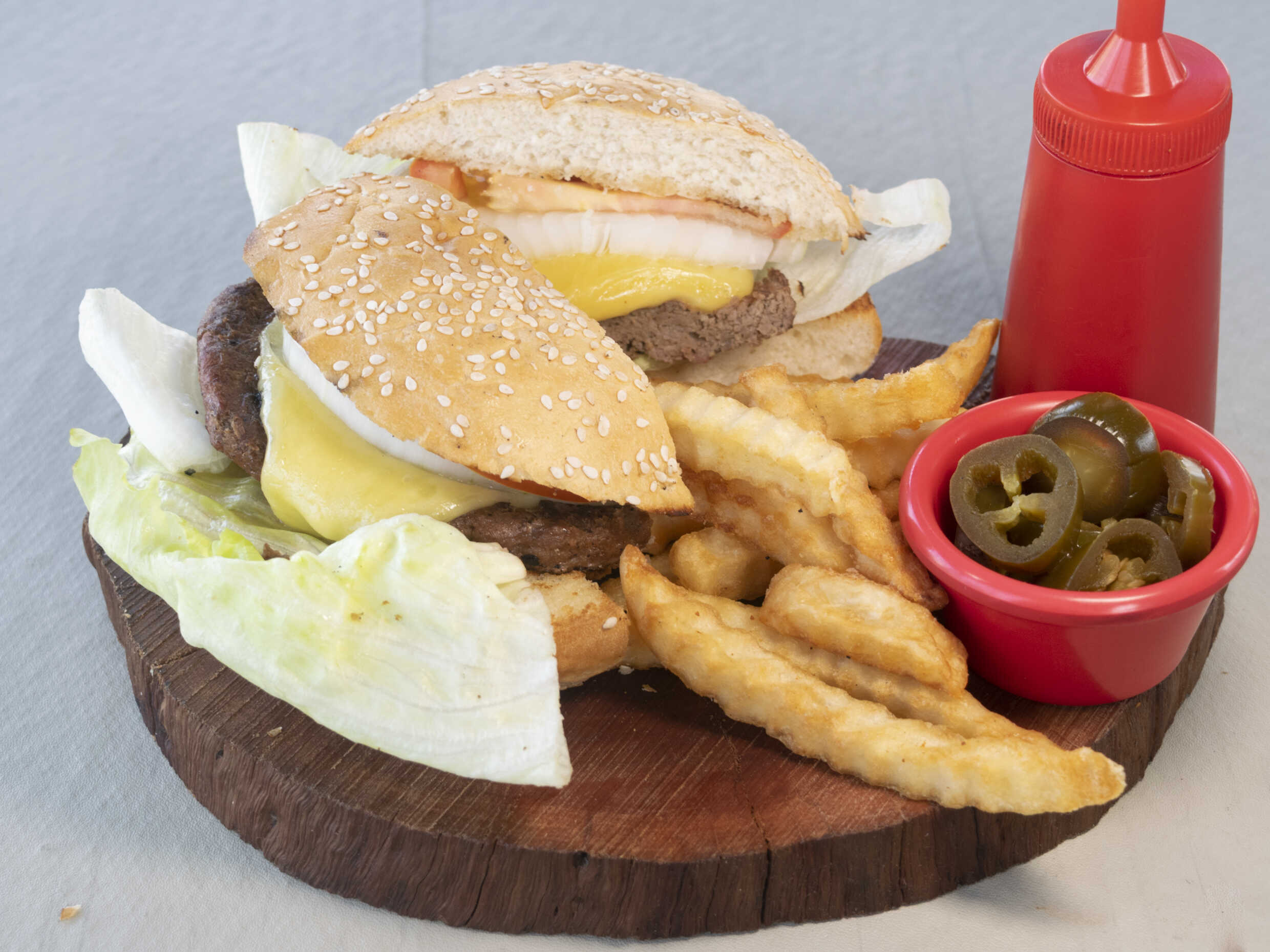 Tradicional hamburugesa de carne de res (180gr), cebolla, tomate, lechuga y queso chihuahua gratinado. Acompañada con papas a la francesa.