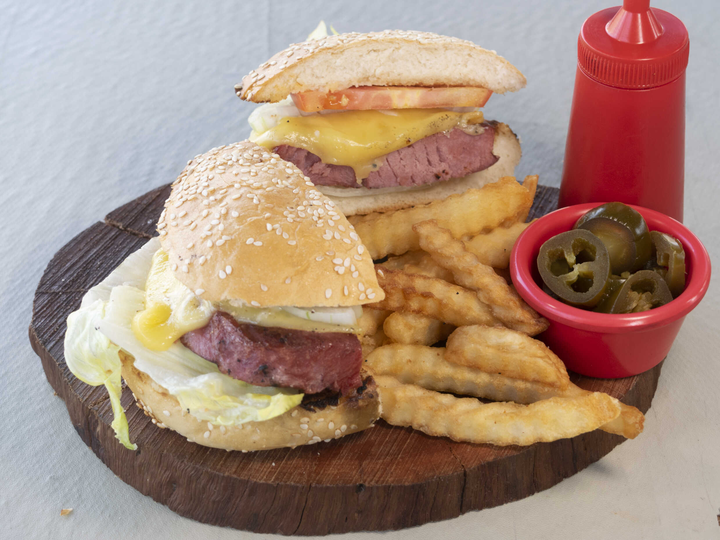 Doble carne de res (360gr), cebolla, tomate, lechuga y queso chihuahua gratinado. Acompaña con papas a la francesa.