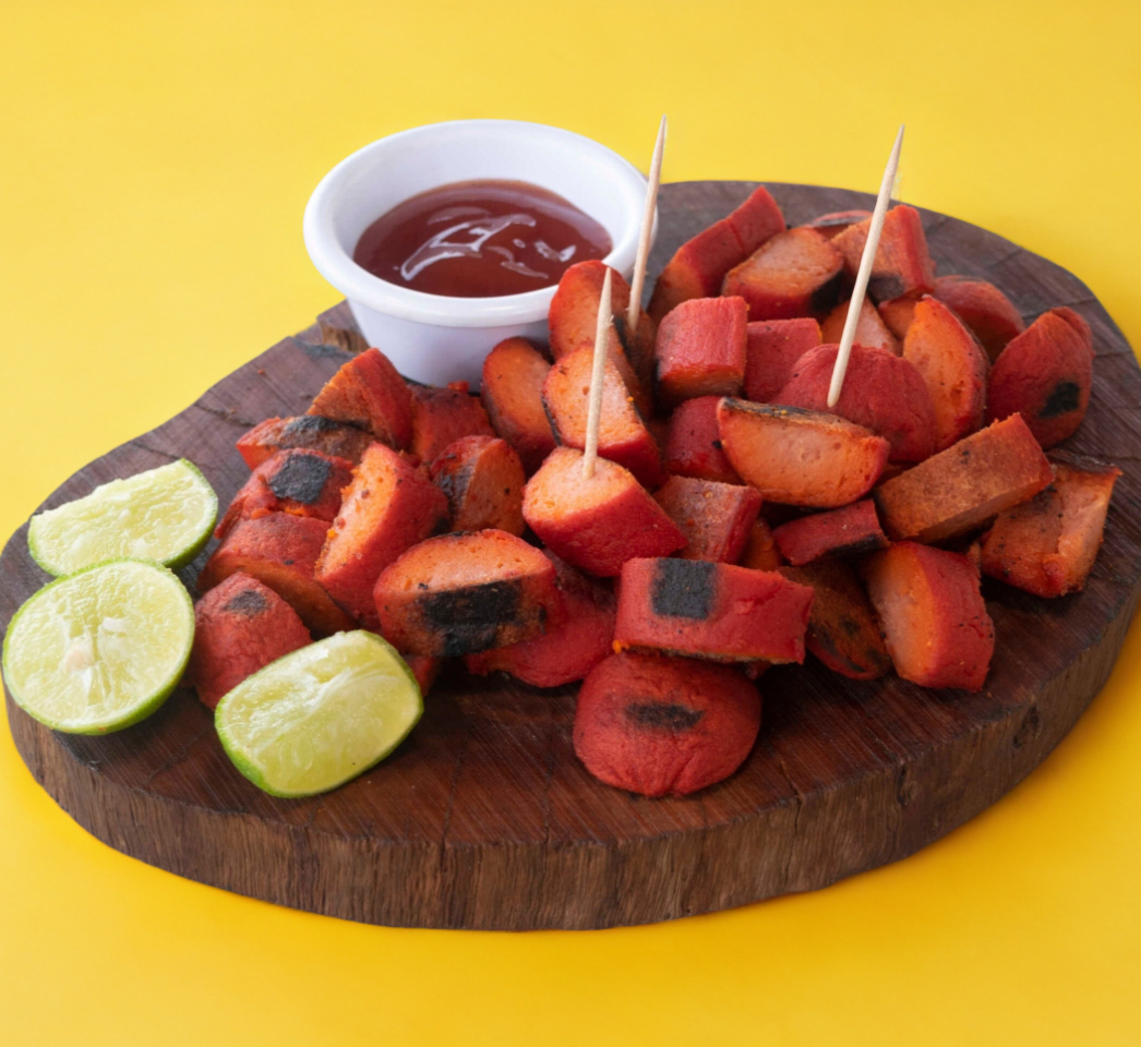 Tradicionales salchichas asadas al grill. Acompañadas de salsa picante y limón.