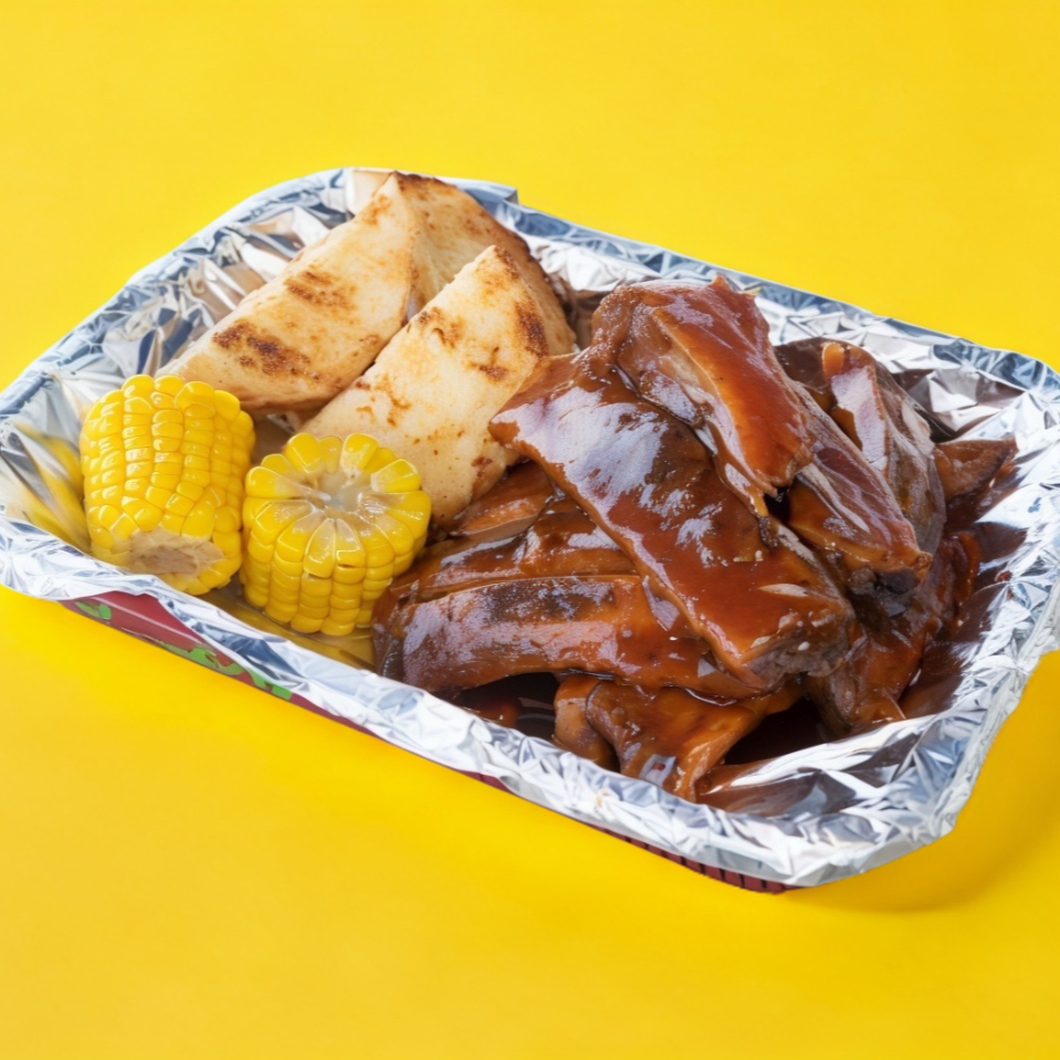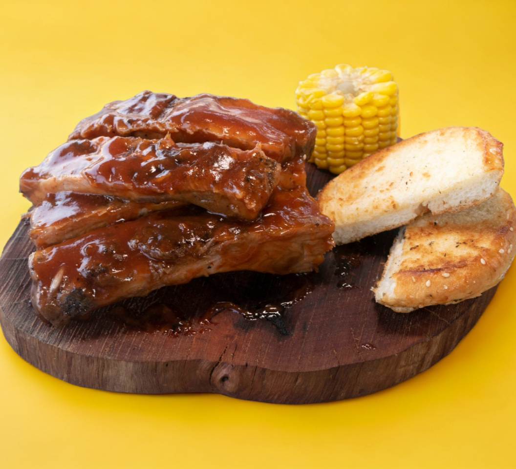 Costillas a la BBQ al carbón. (Acompañadas de dos piezas de elote dorado y pan de hamburguesa con mantequilla) (1 KG de costilla cruda equivale a 650 gramos preparada)