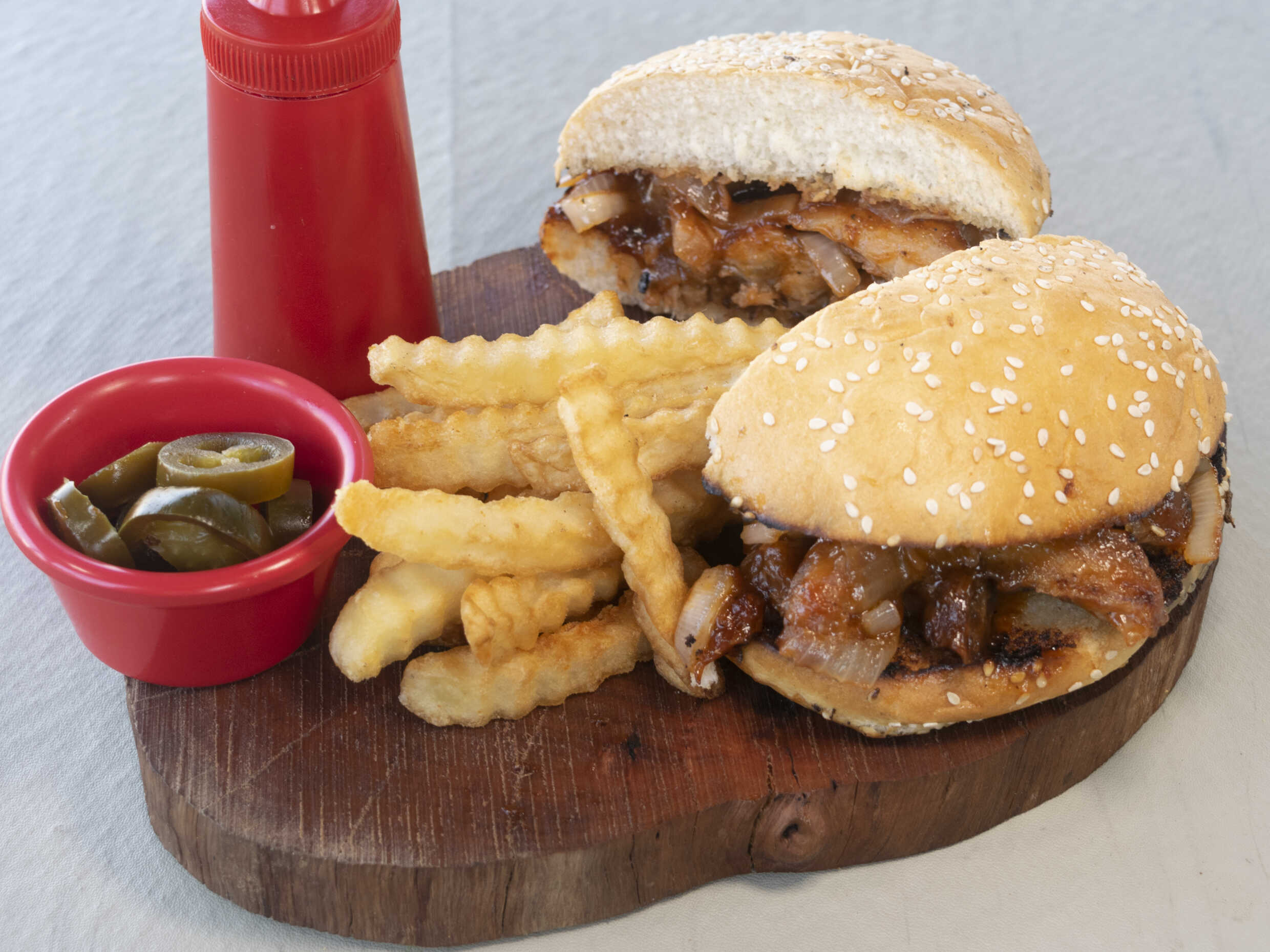 Hamburguesa de costillas bbq sin hueso, preparada con cebolla y mantequilla.