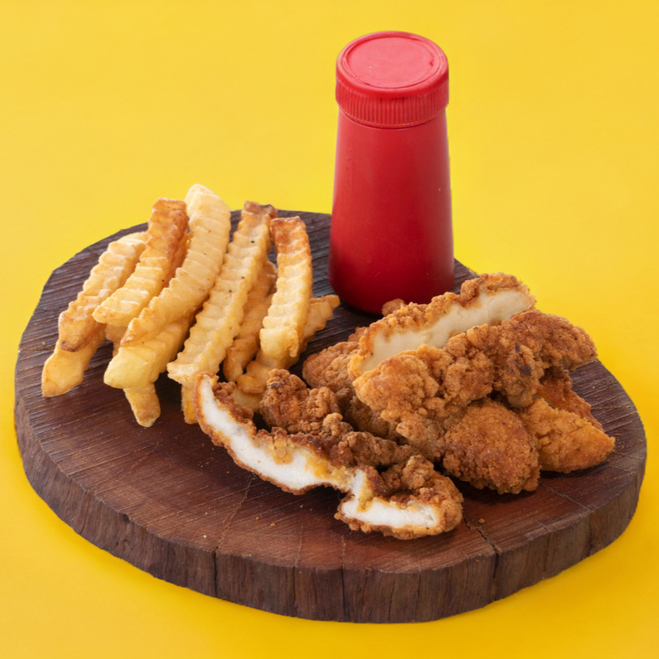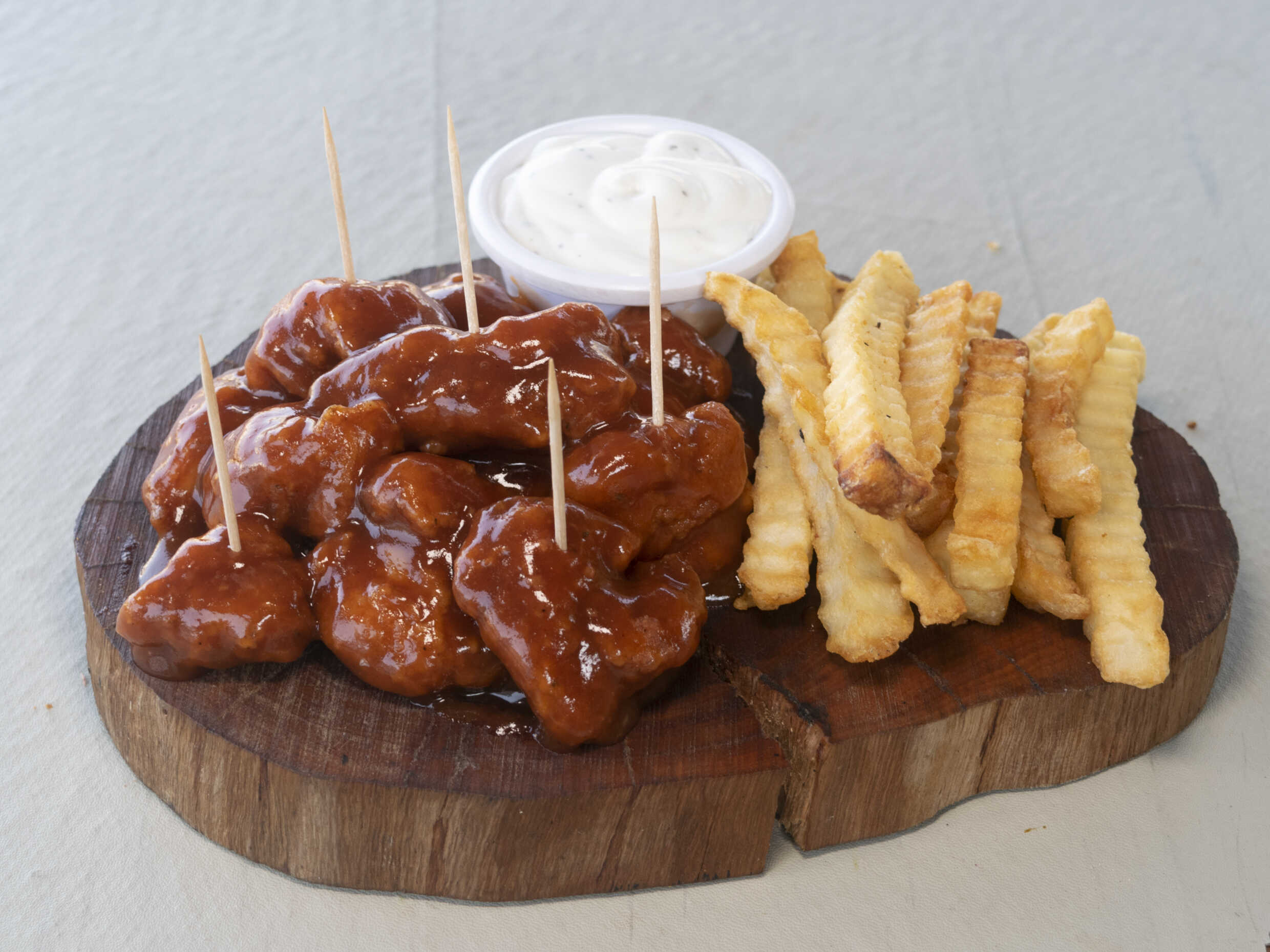 Boneless bañados con nuestra salsa casera, acompañados con papas a la francesa y aderezo ranch.