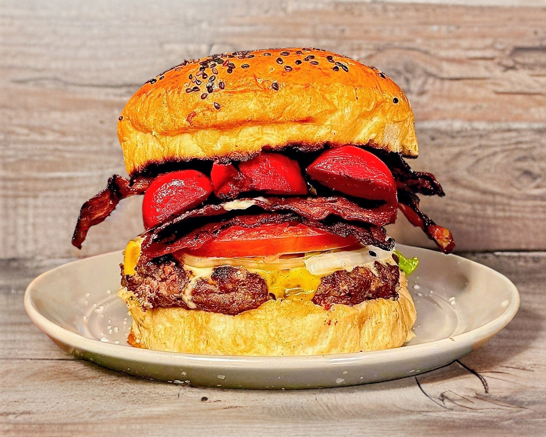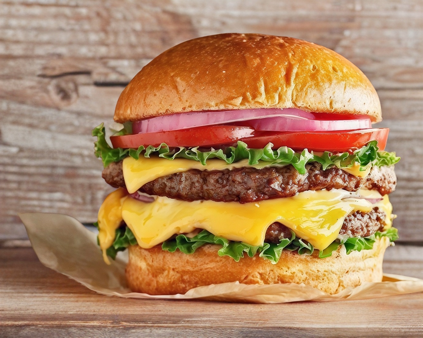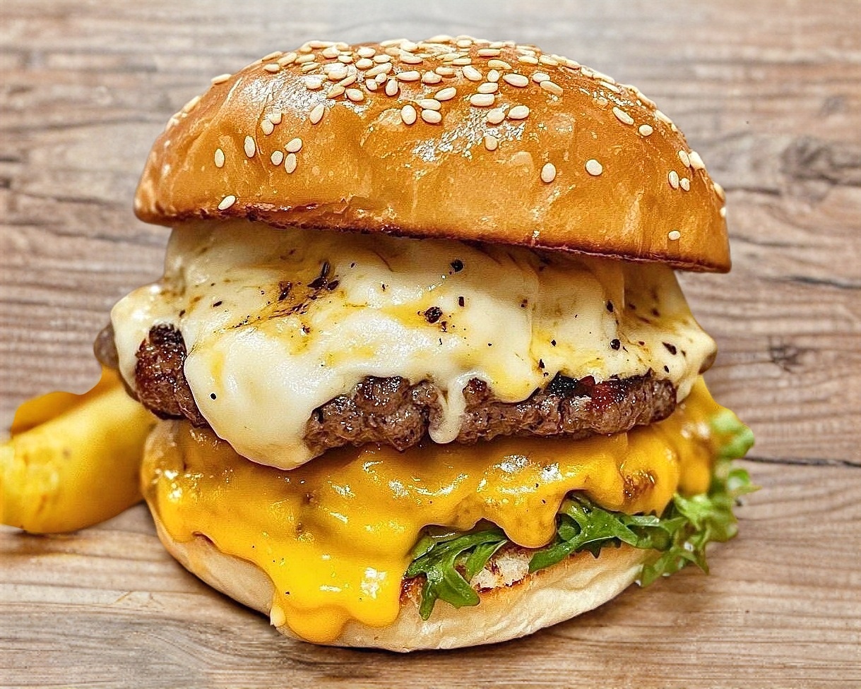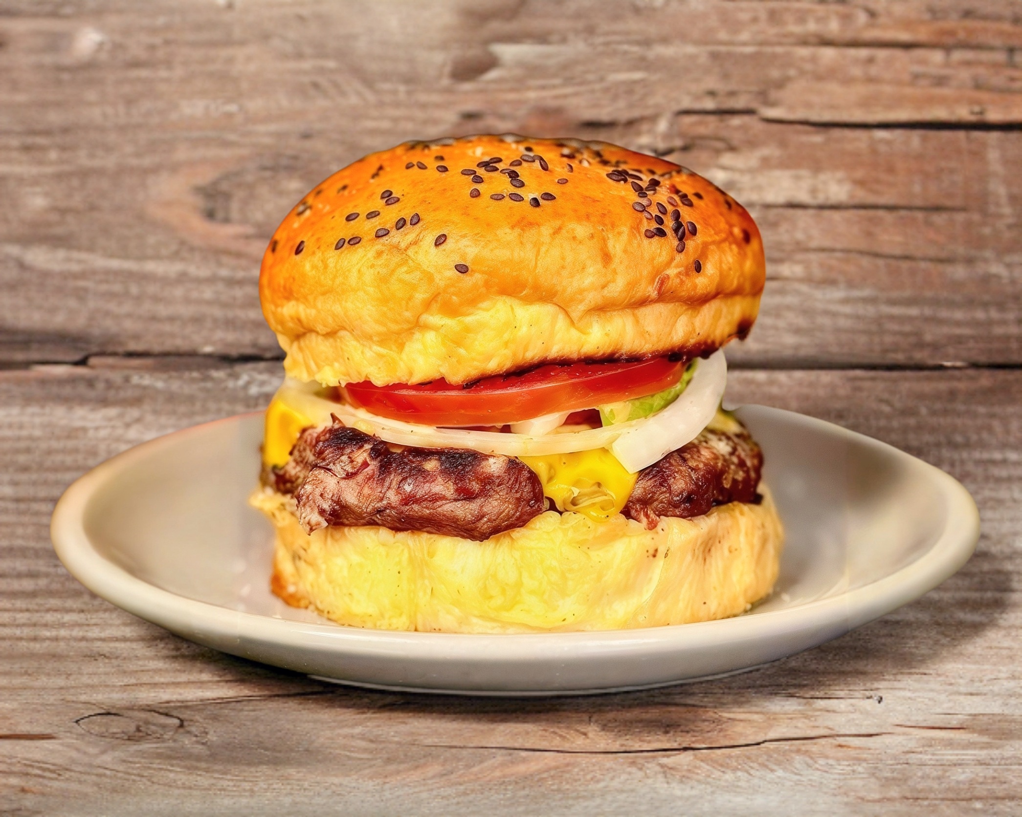 Doble porción de carne, queso amarillo, tomate, cebolla y lechuga. Acompañada con porción de papas a la francesa.