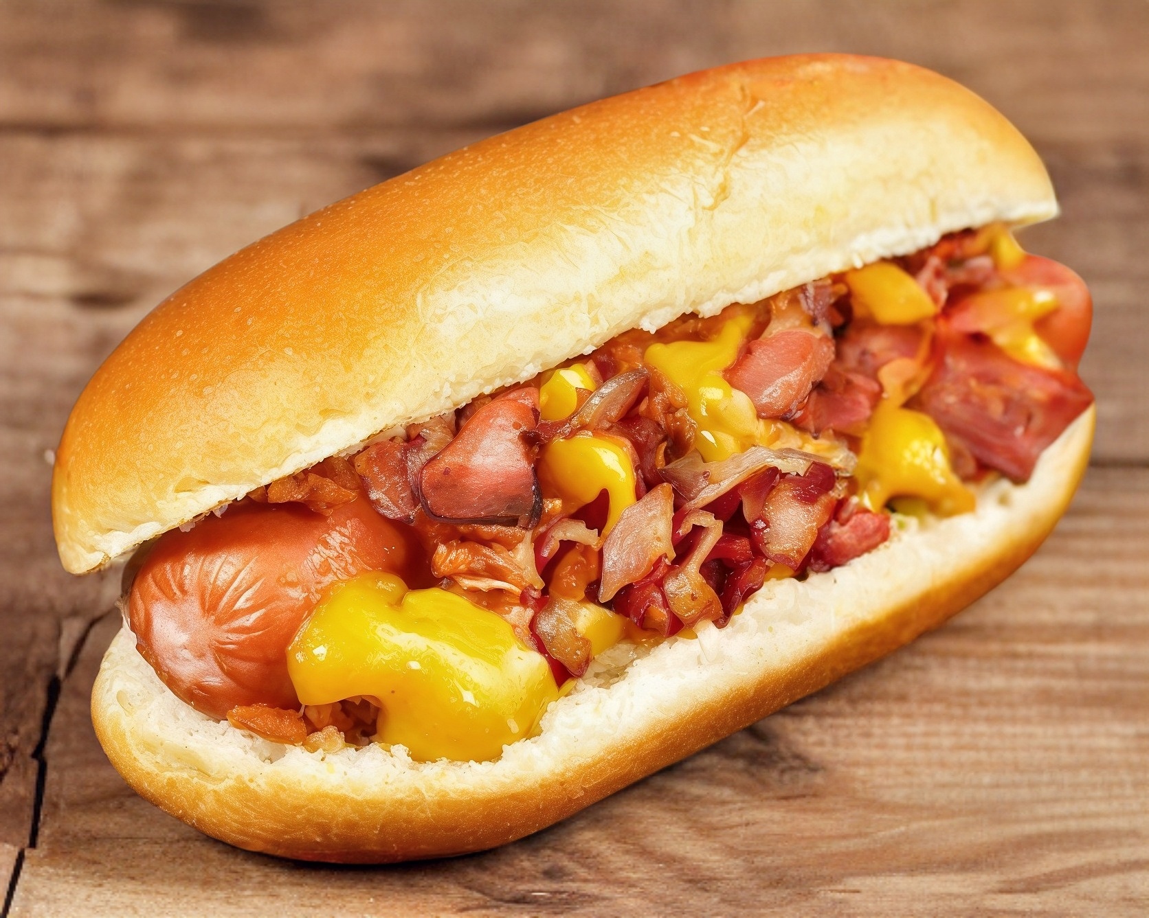 Salchicha asada a la parilla, con tocino y queso MANCHEGO GRATINADO, verdura y aderezos. Acompañado de porción de papas a la francesa.