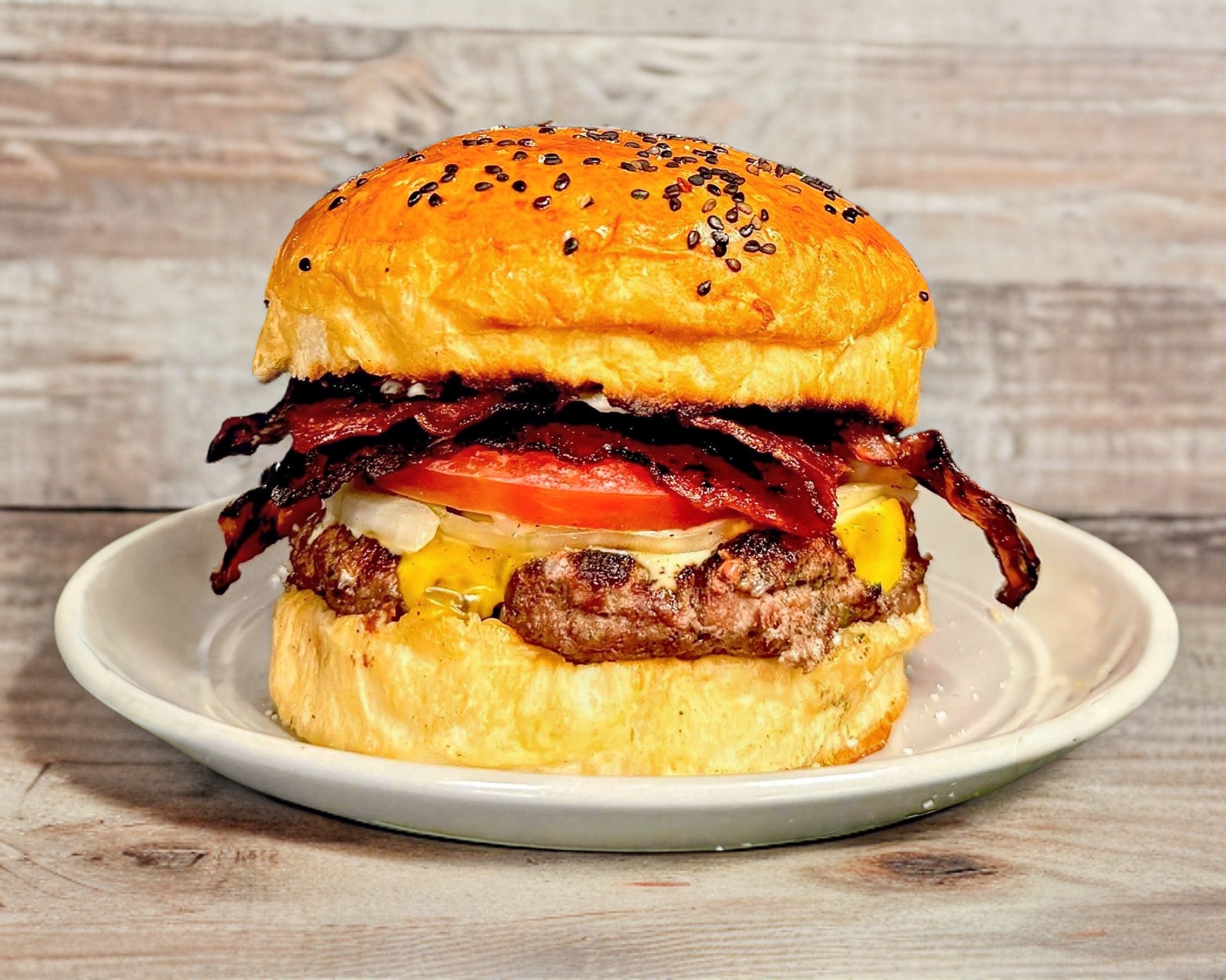 Carne deliciosamente asada a las brasas, tocino asado, queso americano, cebolla, tomate, lechuga. Con porción de papas a la francesa.