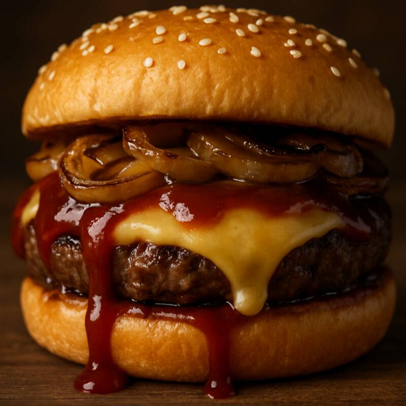 180 gr de carne rectea de la casa, pan artesanal, salsa bbq, cebolla caramelizada, queso derretido, verdura y aderezos. Acompañada con porción de papas