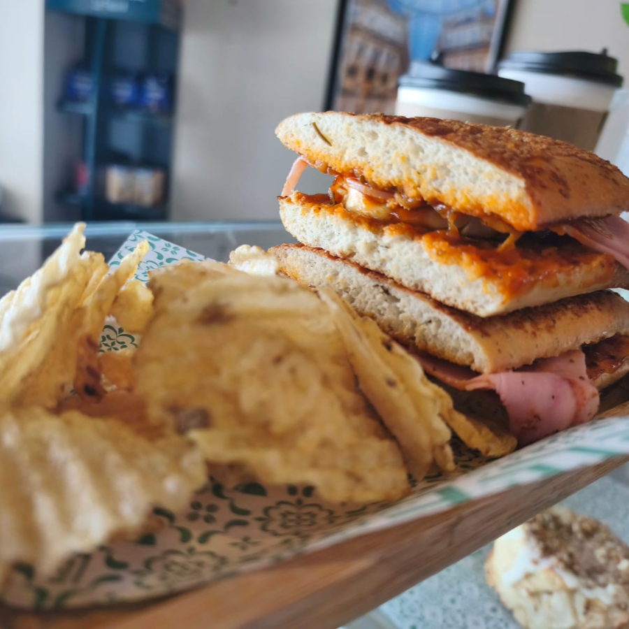 Pan ciabatta, salsa pomodoro de la casa, queso mozzarella fresco y jamón. Acompañado de papas chips.
