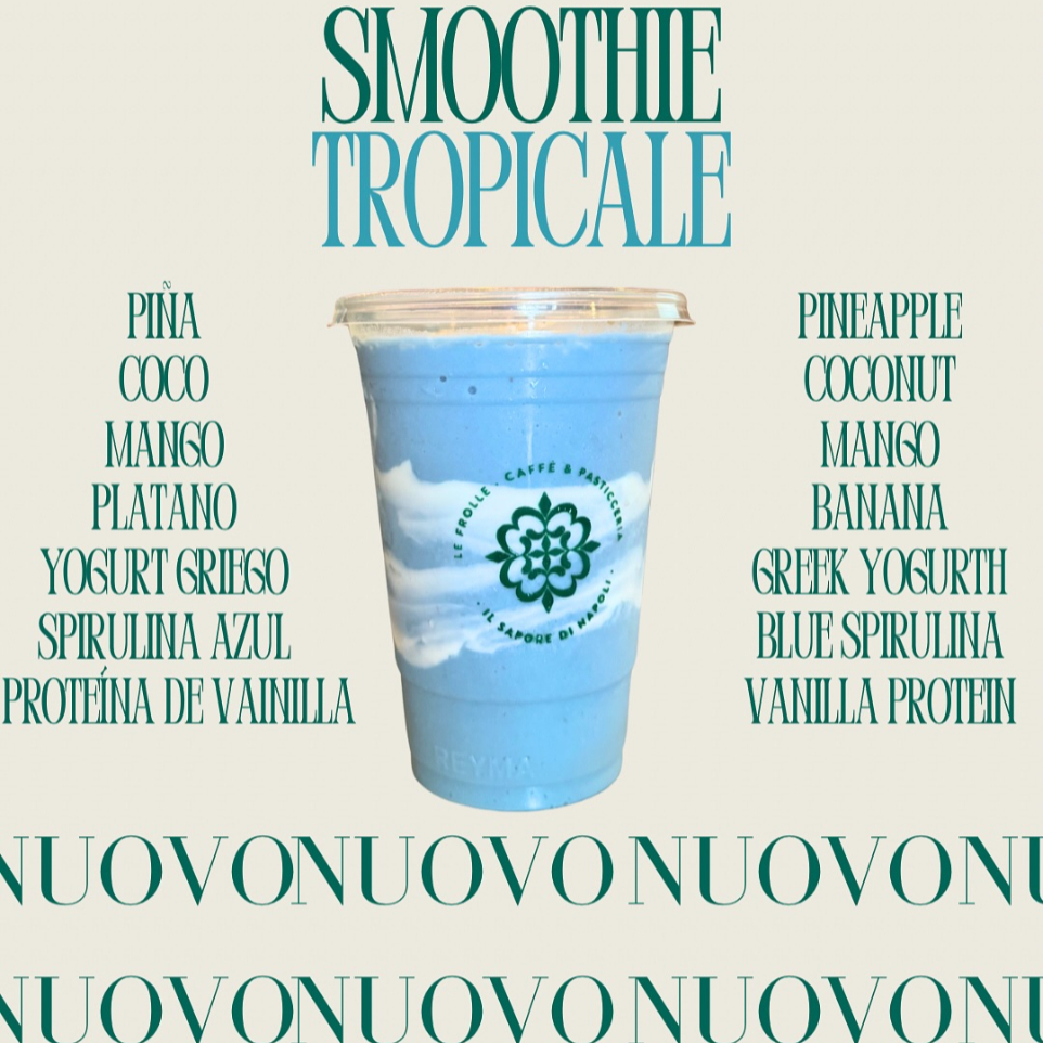 Mango, Platano, Coco, Piña, Yogurth Griego, Proteina de Vainilla Birdman y Espirulina azul, decorado con coco rayado