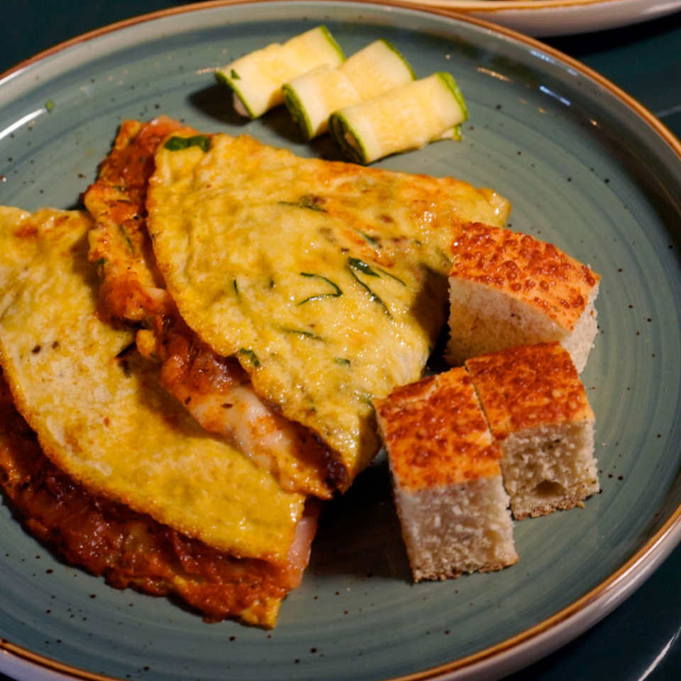Delicioso omelette con espinaca, tomate, queso mozzarella, jamón y salsa pomodoro de la casa. Acompañado de pan y decorado con tiras de calabacita rellenas de queso crema.