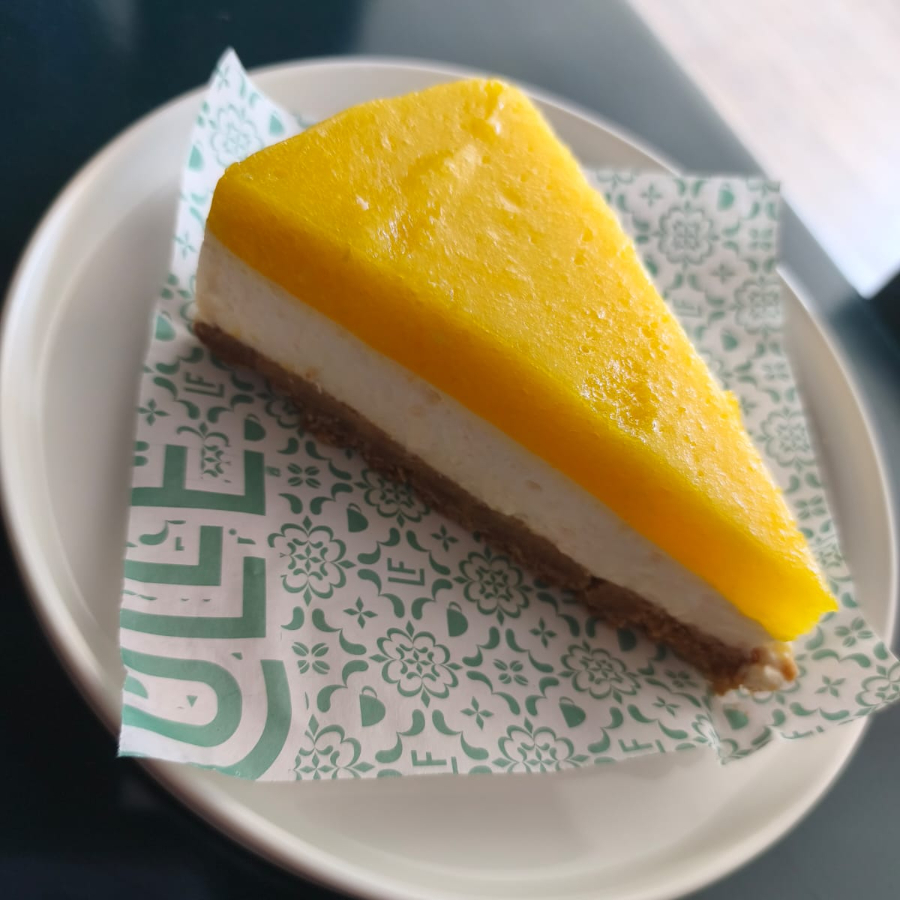 Pay a base de yogurt griego, cubierto de mango natural. Refrescante y delicioso.