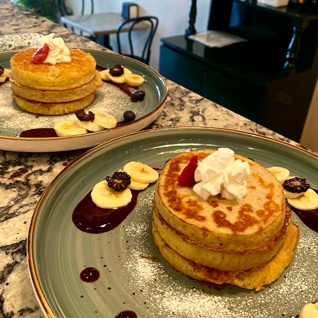Deliciosos pancakes de queso ricotta, ralladura de limón y naranja, decorados con fruta de temporada, mermelada de frutos rojos y crema batida.
