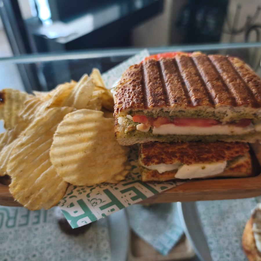 Pan ciabatta, pesto, tomate y queso mozzarella fresco. Acompañado de papas chips.