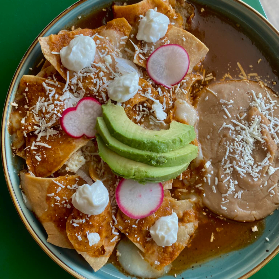 Deliciosos Chilaquiles de salsa roja, queso cotija, crema ácida, cebolla cambray curtida y aguacate. Acompañados de ricos frijoles refritos.