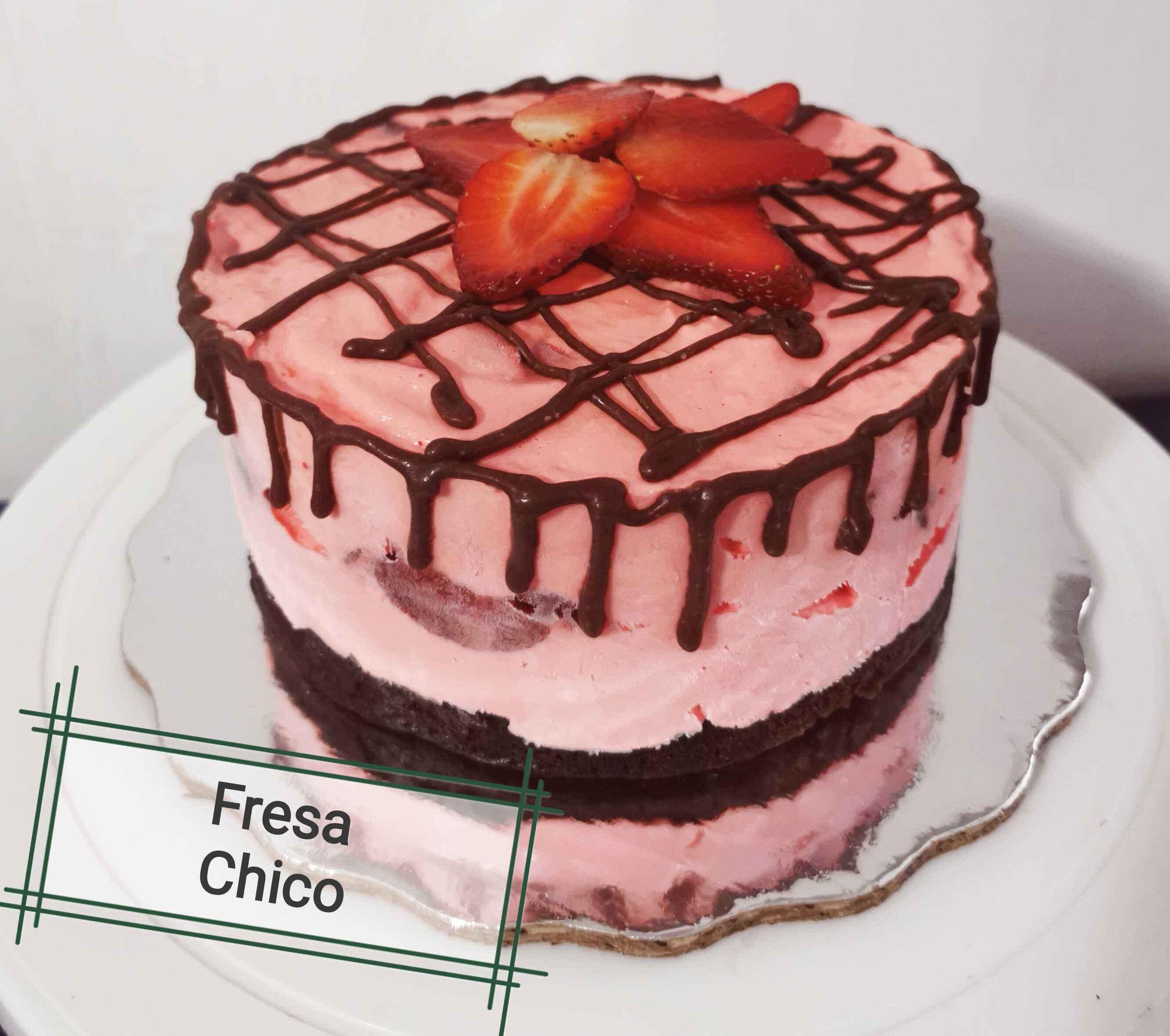 CHICO(6-8 Personas) Helado sabor fresa, relleno de fresas, cobertura de chocolate y base de pan de chocolate. un sabor delicioso que se siente refrescante y ligero.