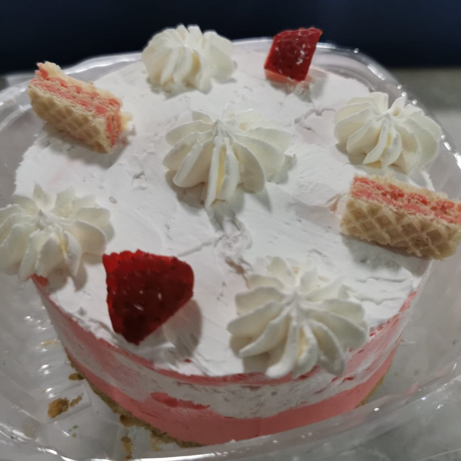 Helado sabor fresa, relleno de muchos trocitos de fresa, Mezclado con deliciosas capas de crema, base de galleta, cubierto con una capa de crema y pequeñas galletas sabor fresa. Un sabor muy mazatleco y delicioso.