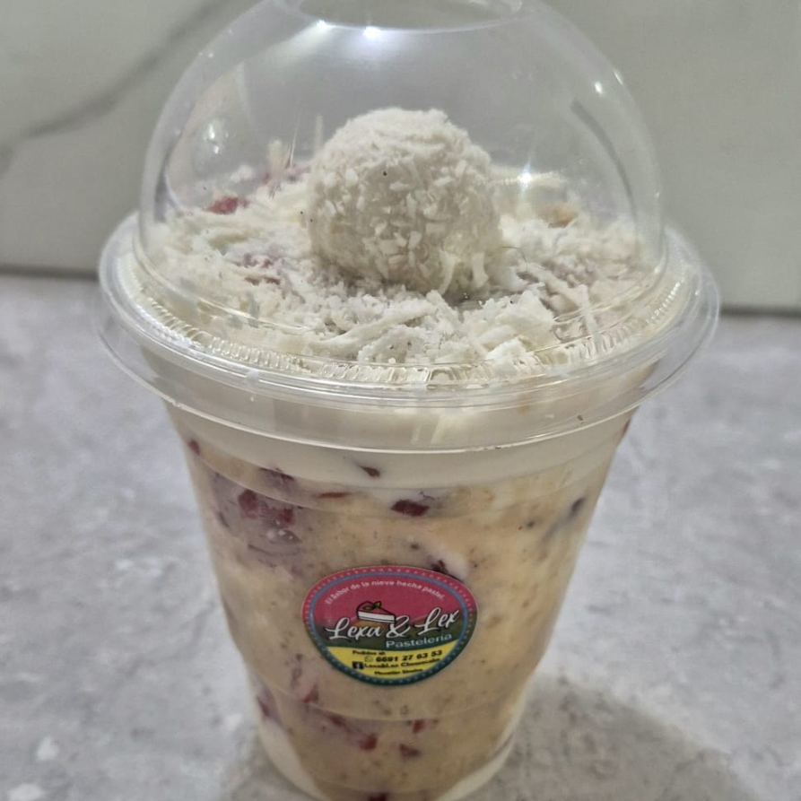 Nuestra deliciosa crema de fresas, combinada con un cremita muy especial sabor Rafaello, mucho coco y decorado con 1 Rafaello