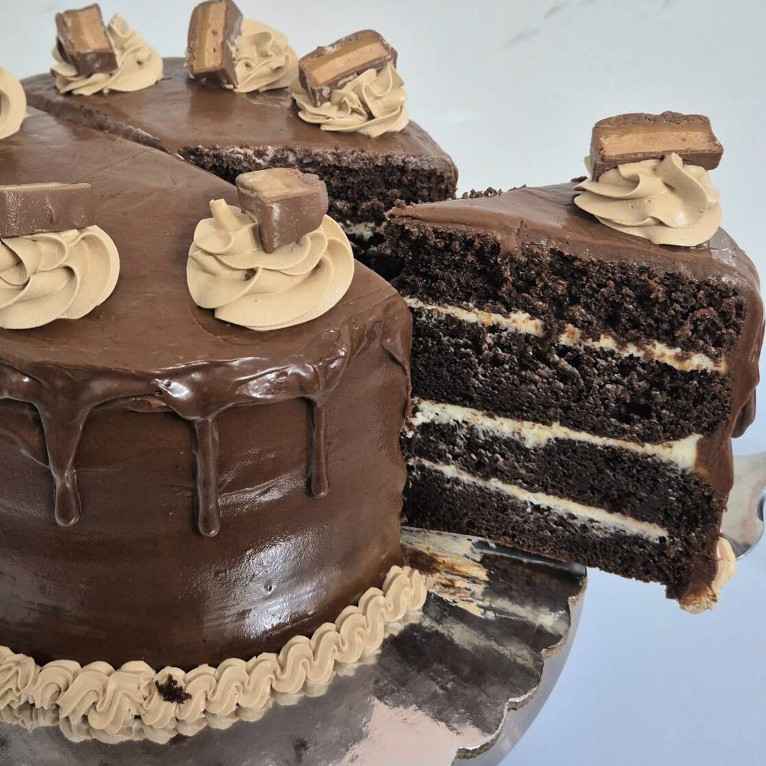 Delicioso y semihumedo pan de chocolate 🍫, con 3 capas de relleno de betun de queso crema 🍰 completamente forrado de chocolate🍫, bañado con mucho chocolate milkyway y decorado de betun de chocolate y trocitos milkyway!! Disponible por Rebanadas!! Un Sabor con mucho placer para todos!! Adictivo! 🤩👌