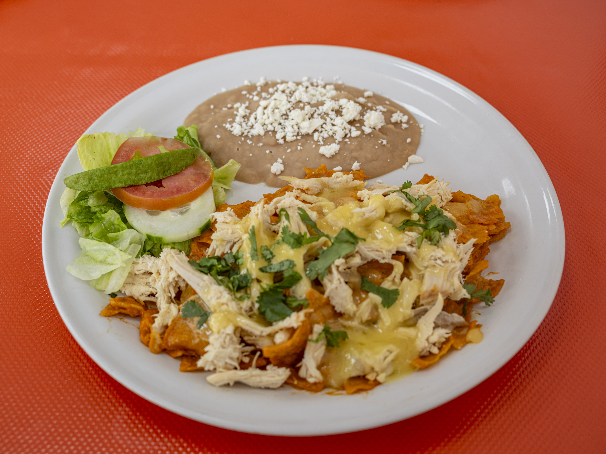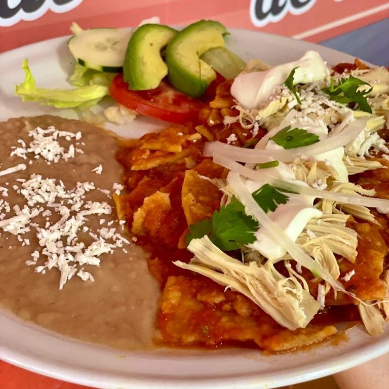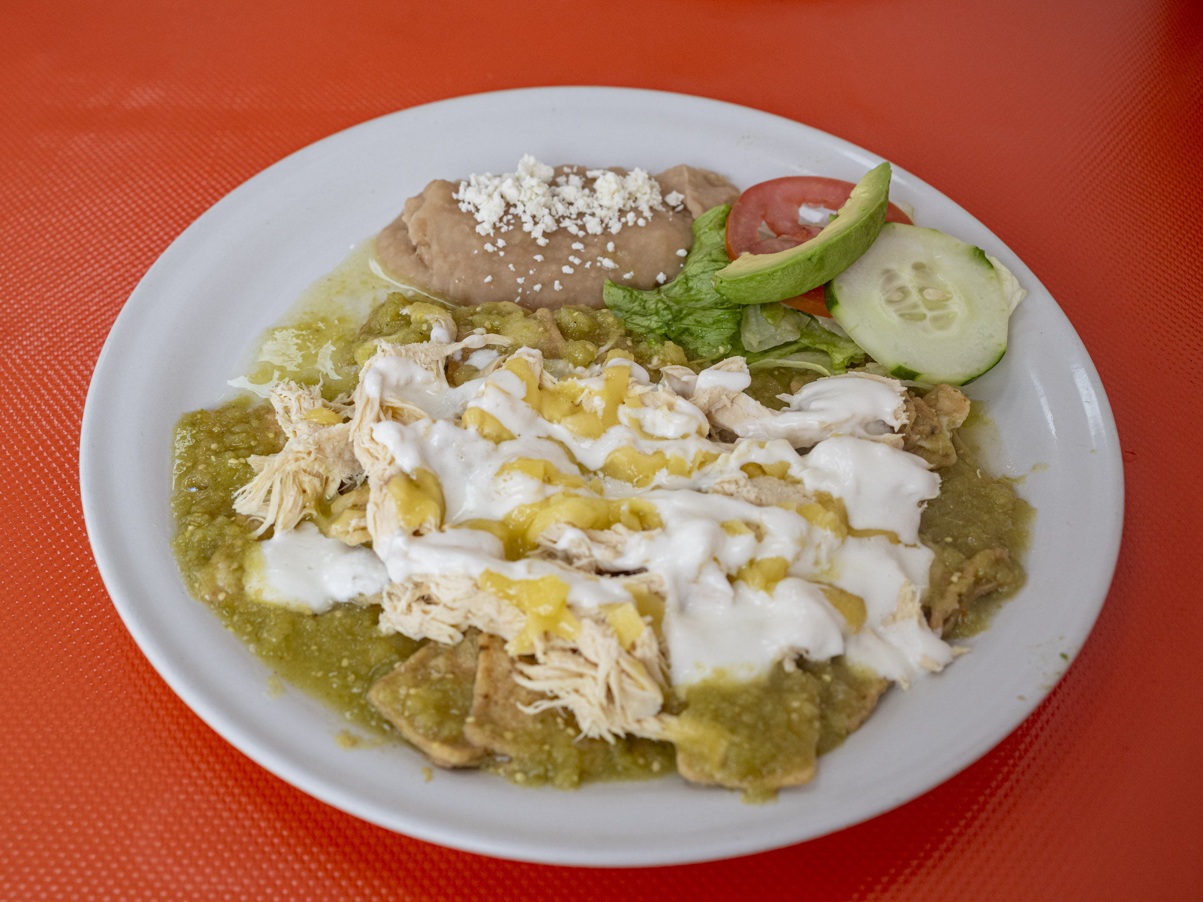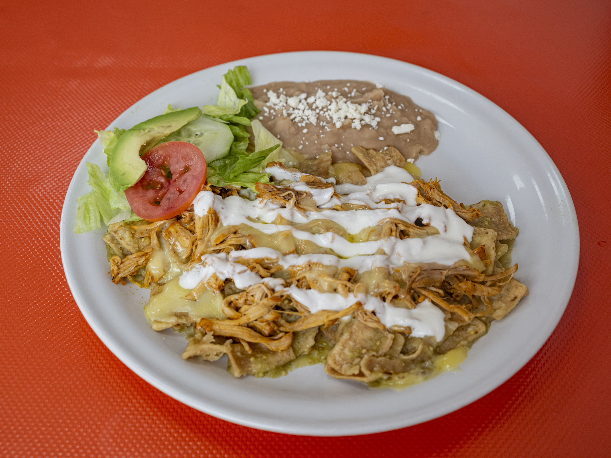 Chilaquiles verdes de tomatillo con crema y queso chihuahua acompañados de frijoles con queso cotija