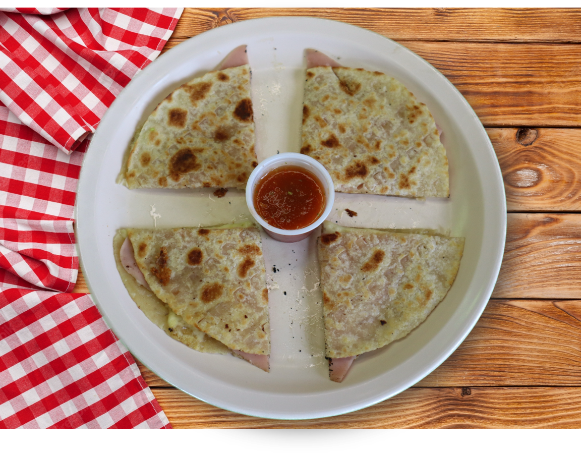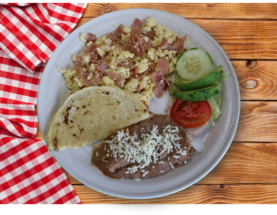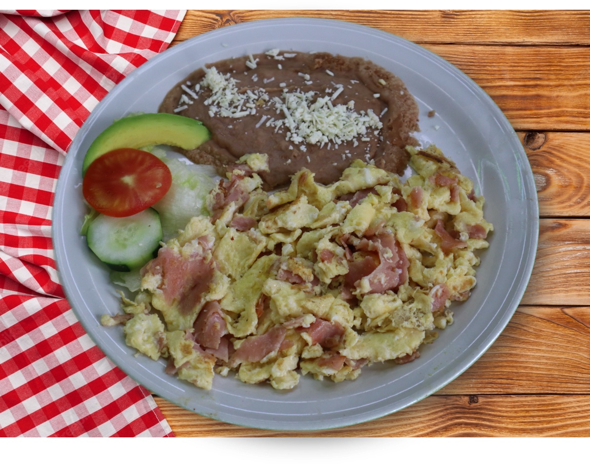 Huevos revueltos con jamón acompañados de una quesadilla de maíz.