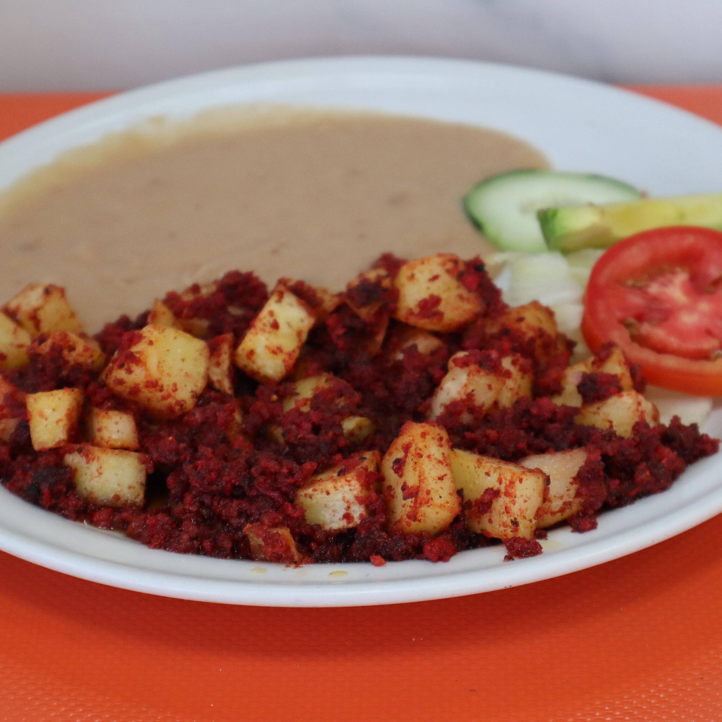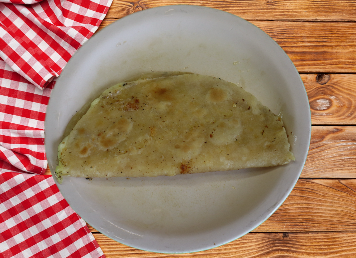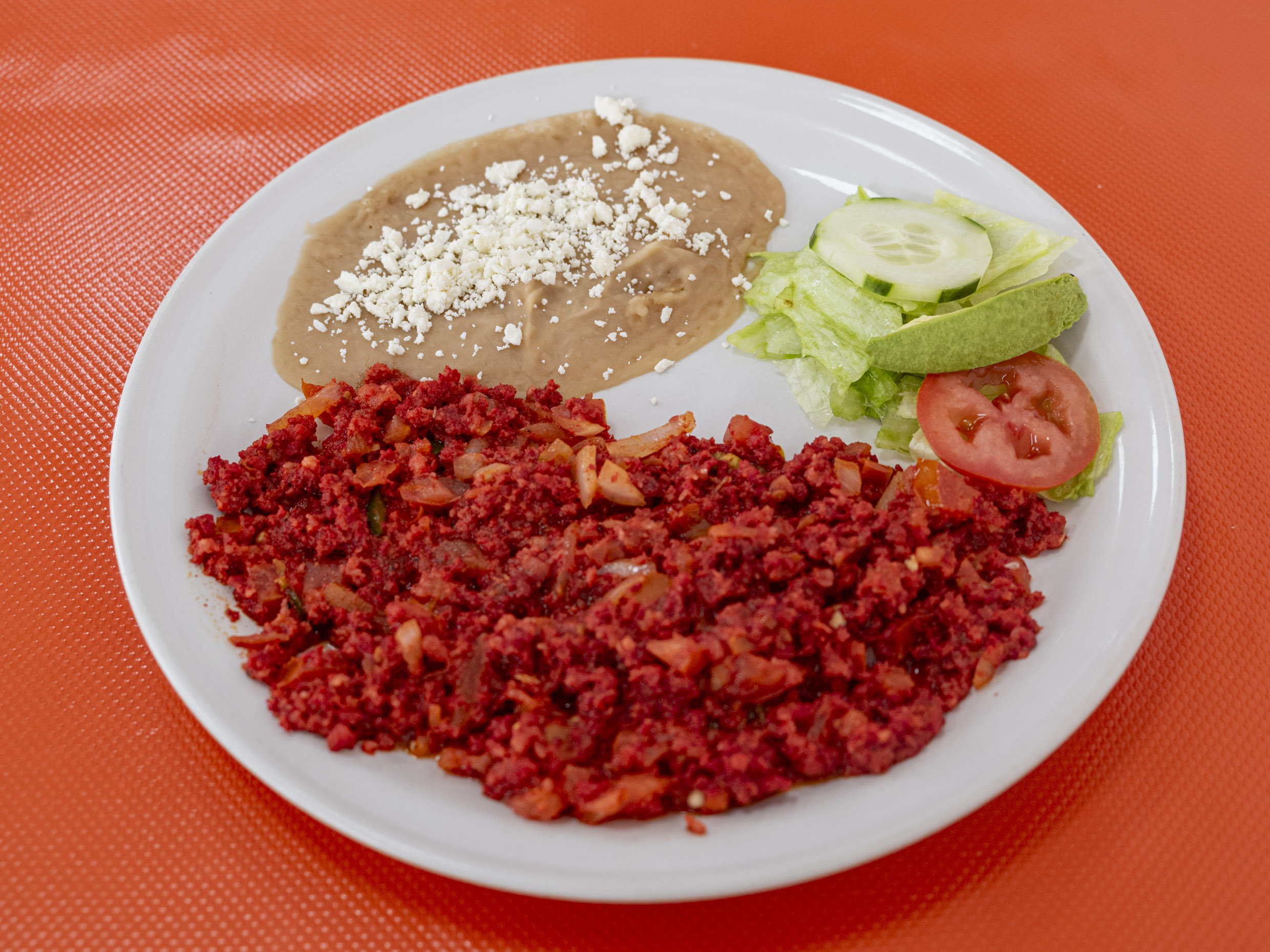 Huevos revueltos con jamón acompañados de una quesadilla de maíz.