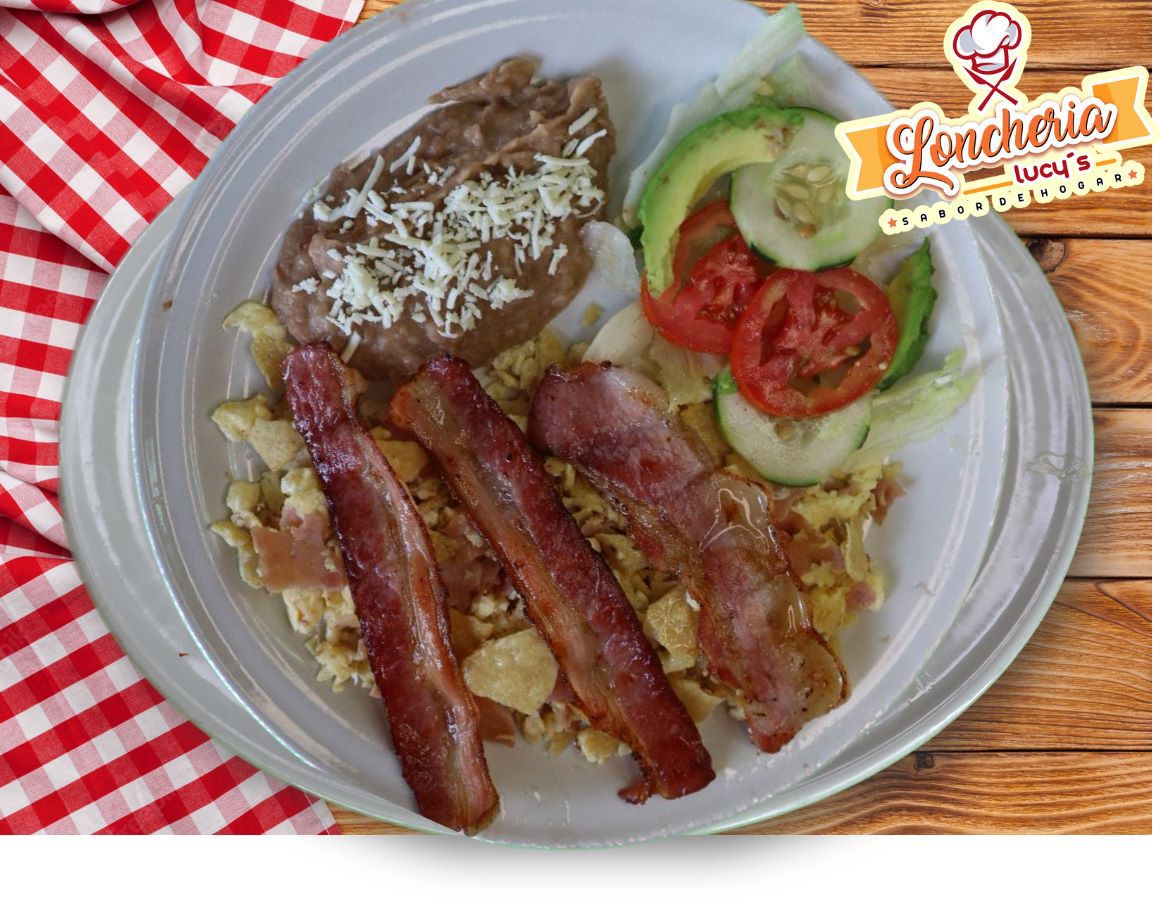 Huevos revueltos con jamón, sopitas y tocino frito a un lado.