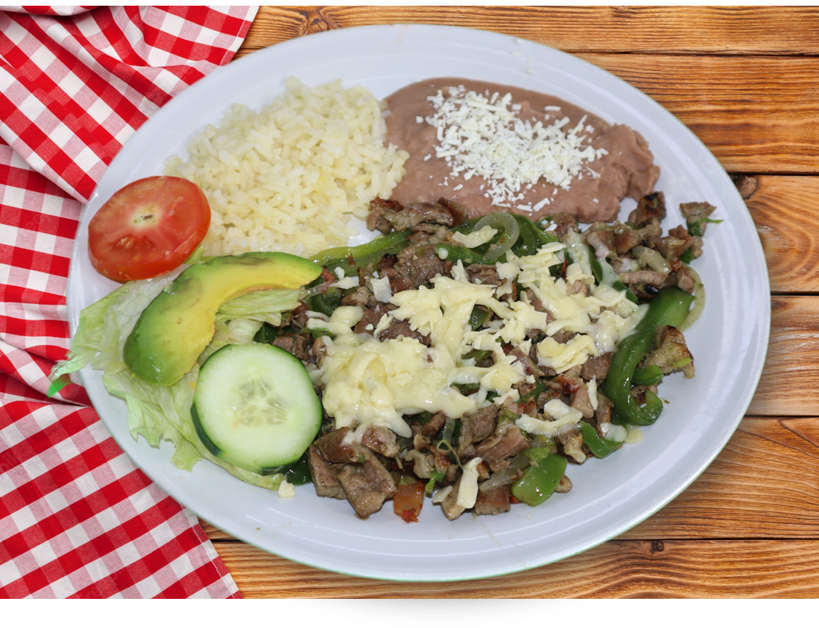 Fajitas de carne guisada con chile morrón , cebolla , tocino y queso gratinado