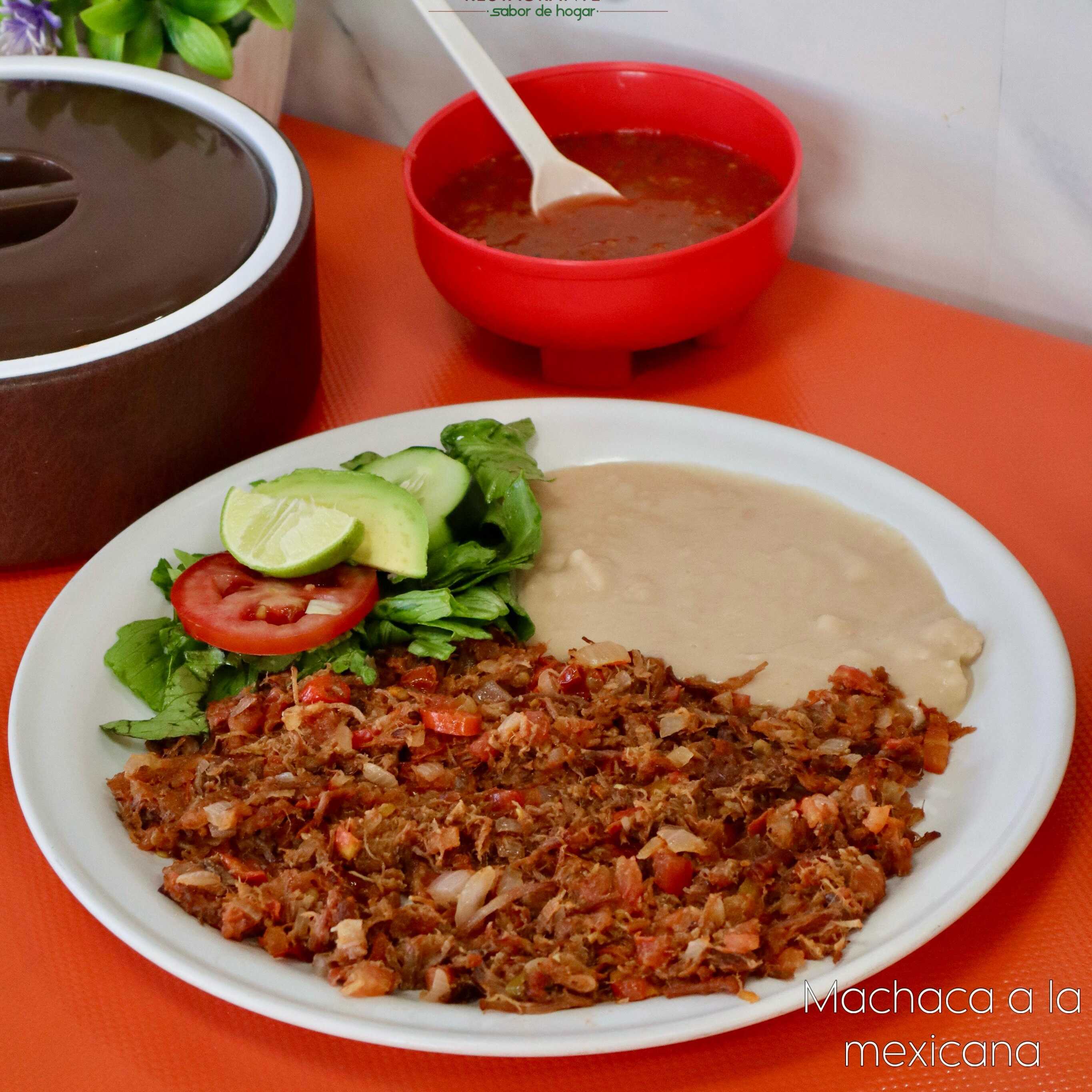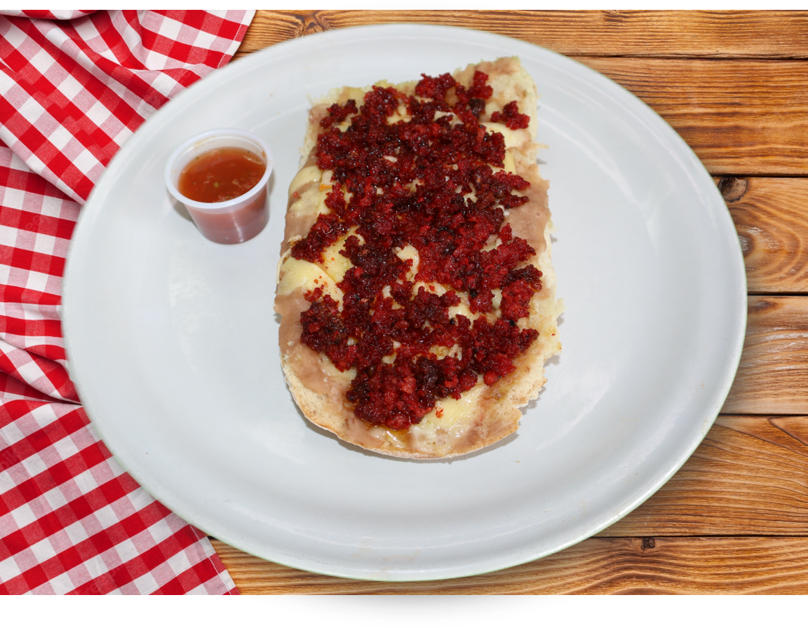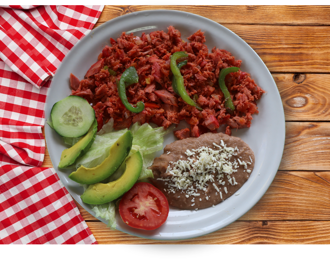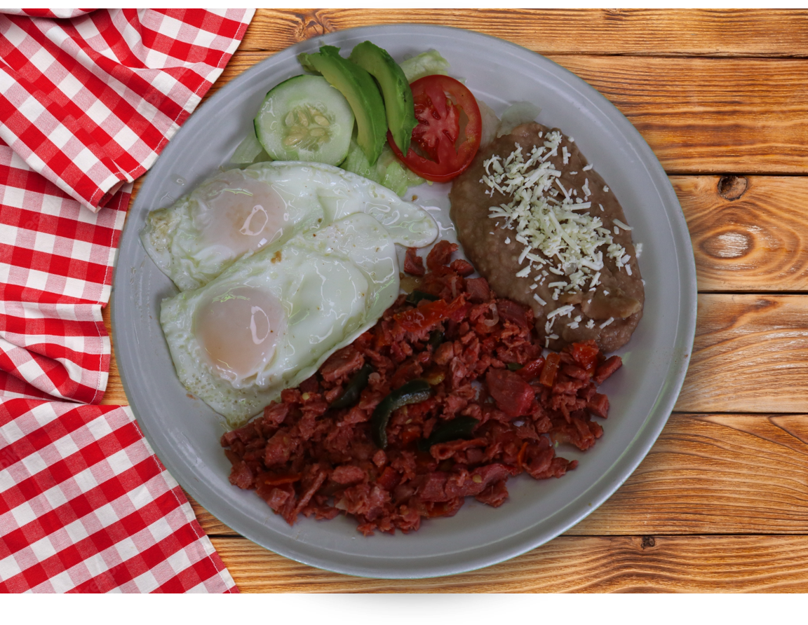 Omelet relleno de machaca asada, acompañado de una salchicha frita.