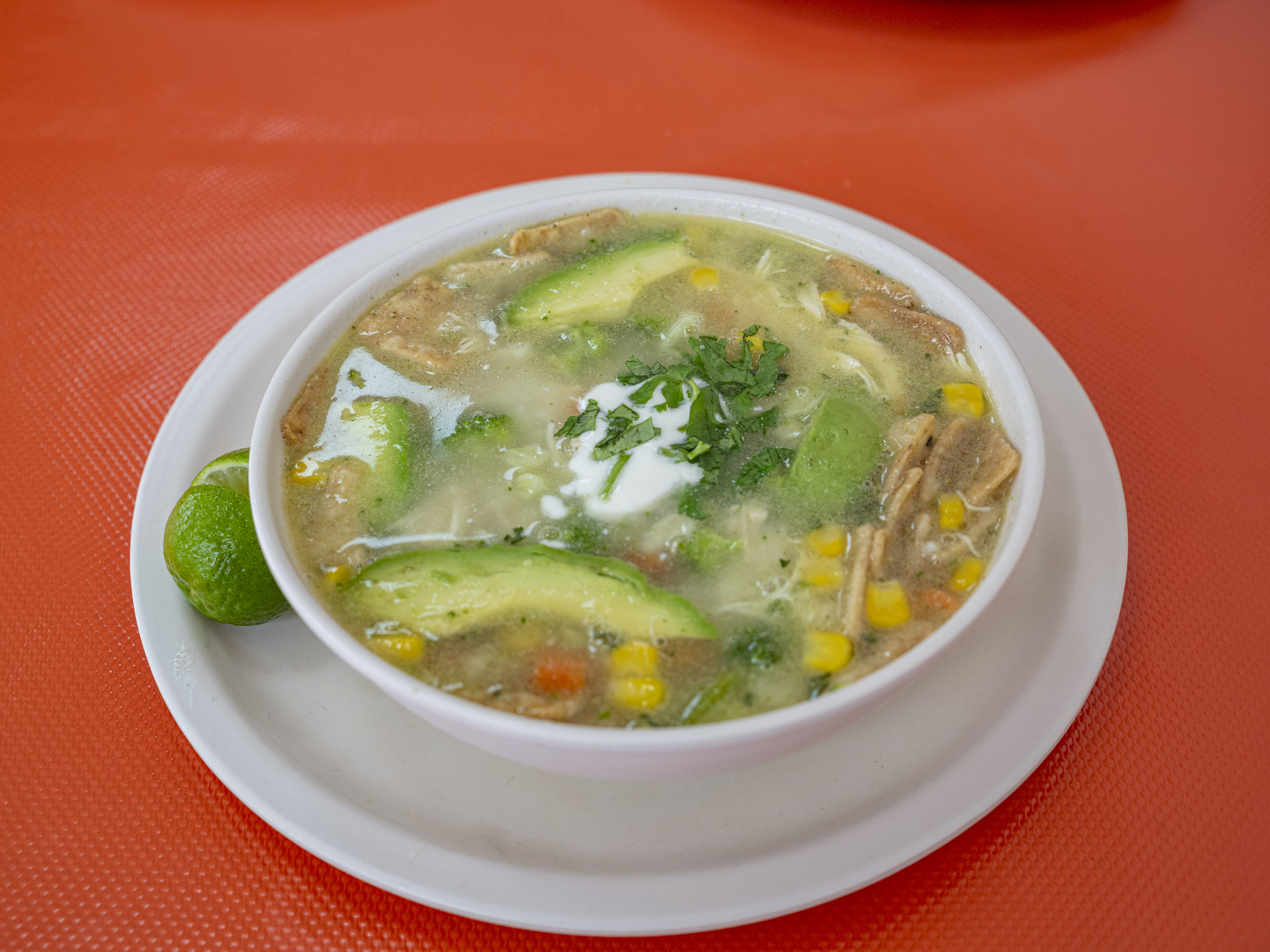 Caldo de pollo, verduras, pollo desmenuzado, crema, aguacate, chile chipotle y totopos.