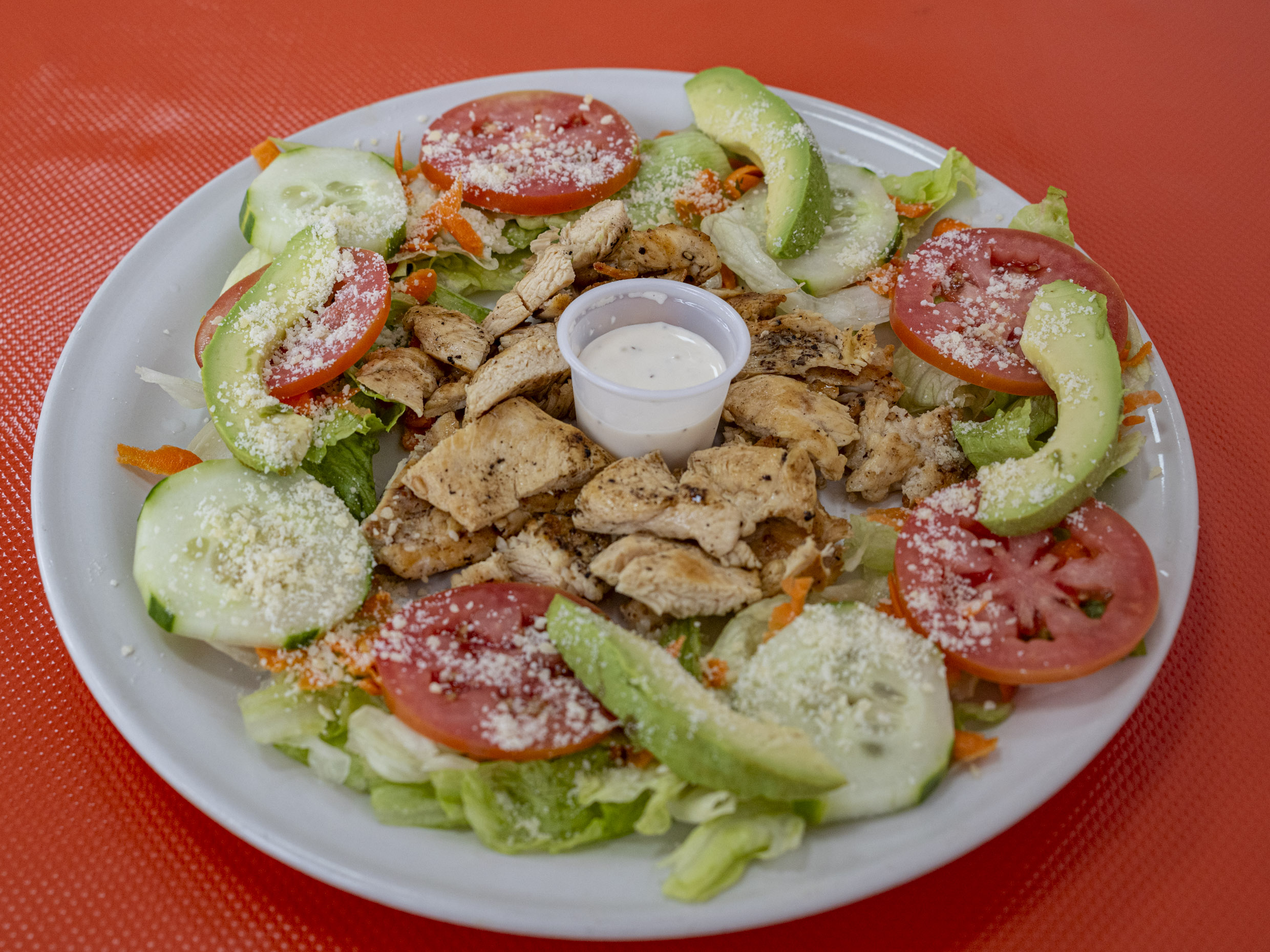 Ensalada fresca con lechuga , aguacate , pepino y tomate al centro pollo a la plancha acompañada de queso parmesano, aderezo ranch y totopos