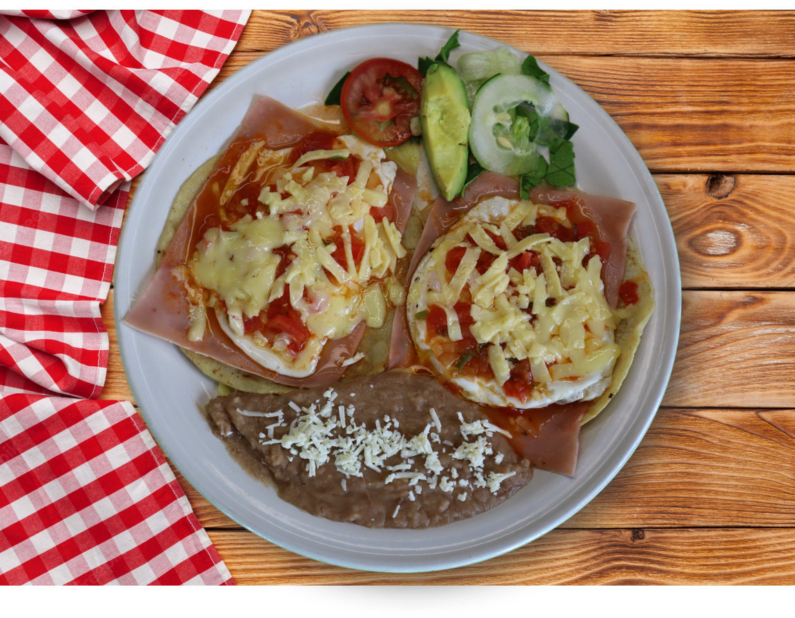 Huevos montados en tortilla frita con jamón, salsa ranchera y gratinados.