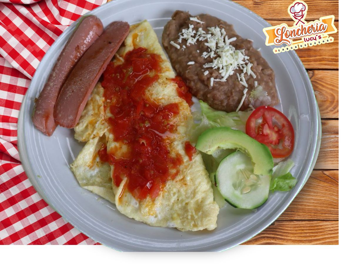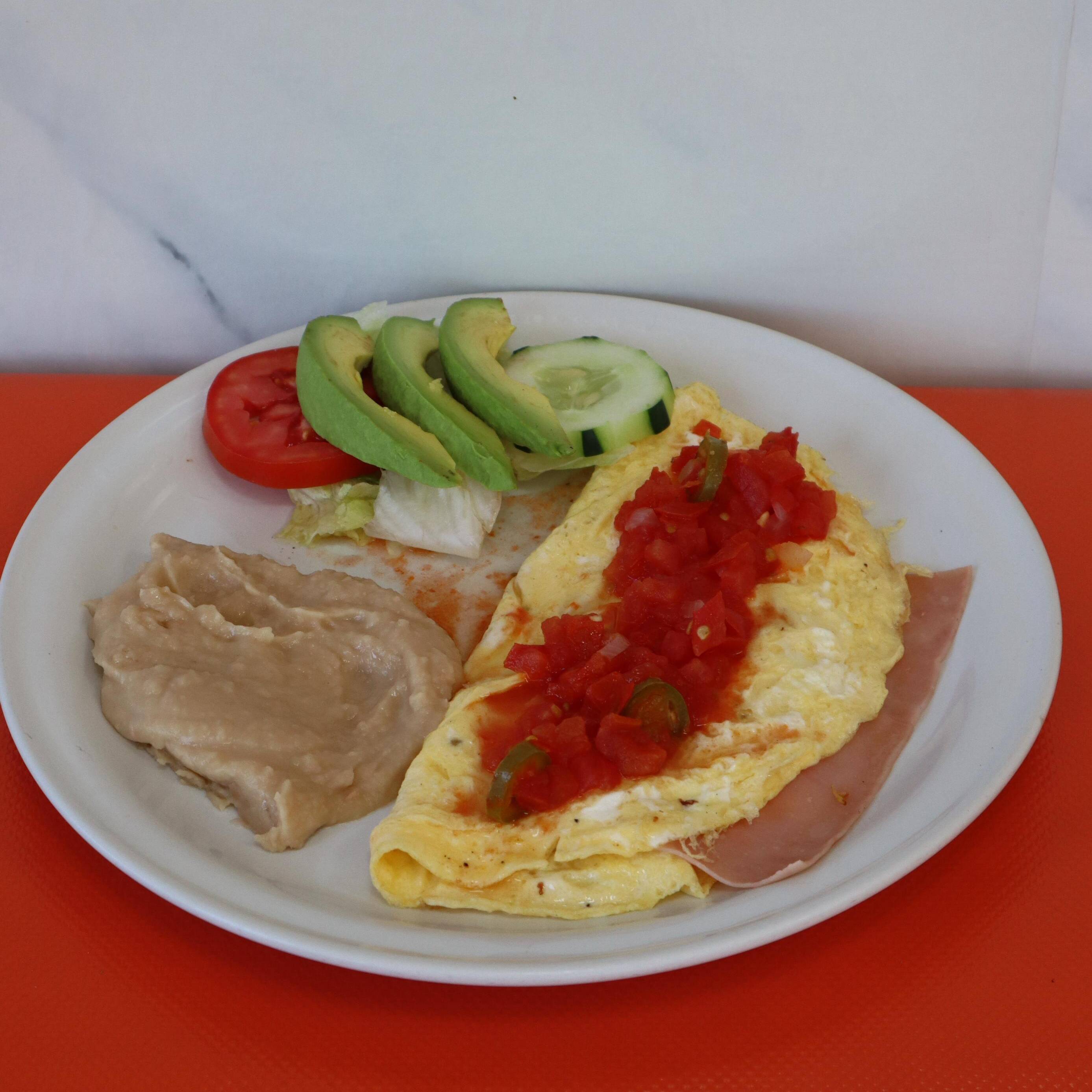 Omelet con salsa de tomate guisada acompañado con frijoles y ensalada