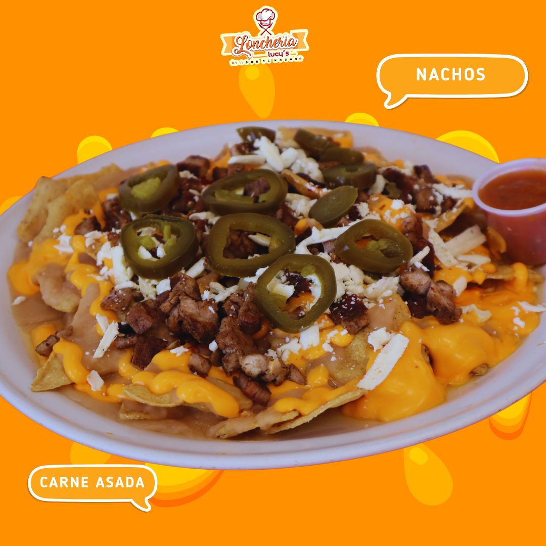 Nachos con queso amarillo,queso seco, carne asada ,frijoles y chile jalapeño