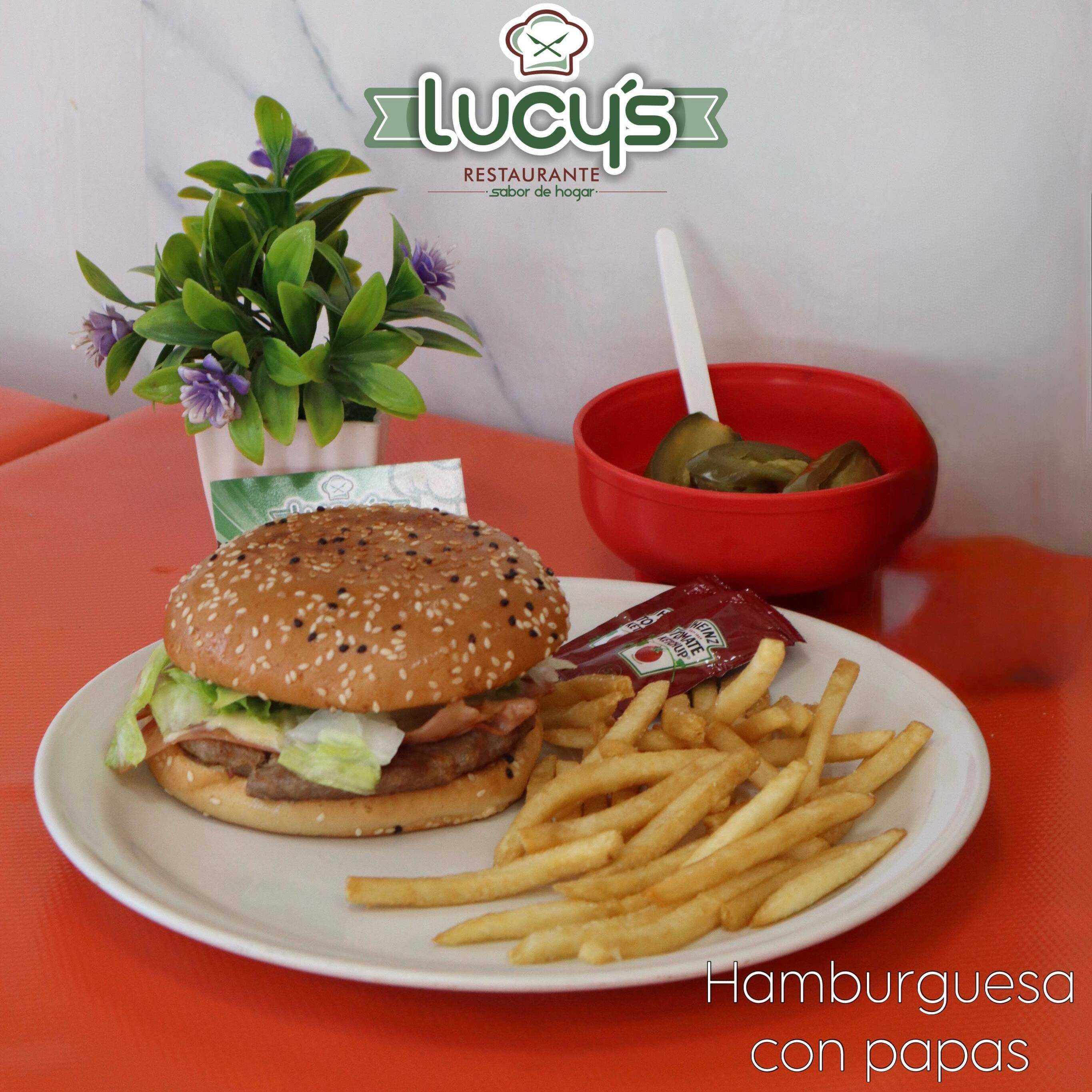 Hamburguesa con carne casera, rebanada de jamón ,queso ,lechuga, tomate , aguacate y papas