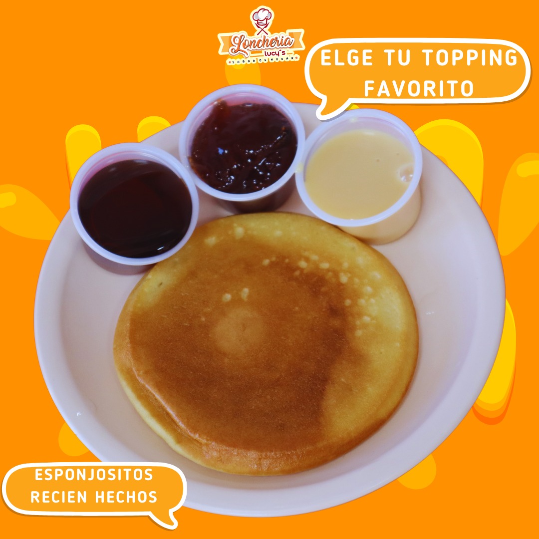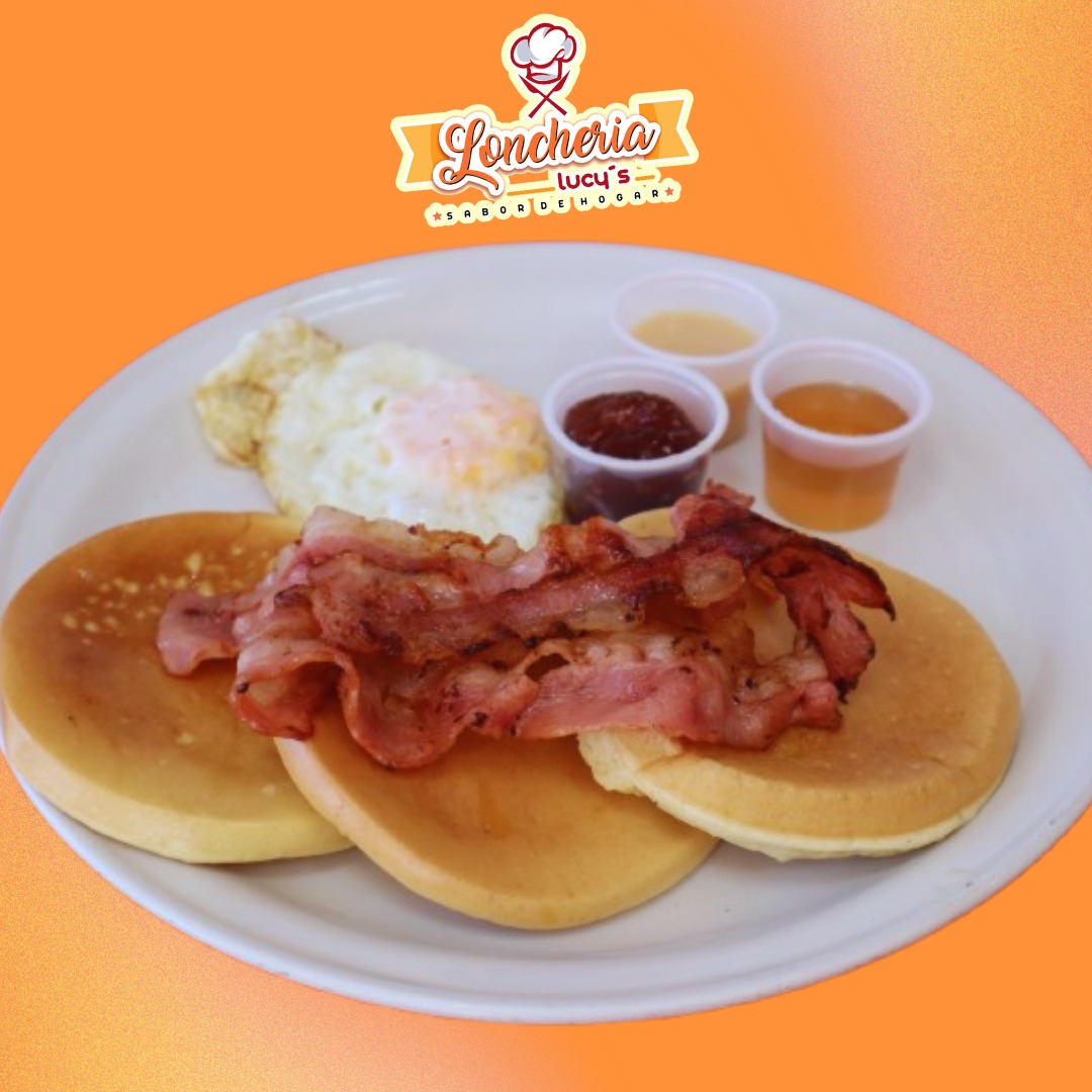 Desayuno estilo americano, 3 hot-cake , huevo estrellado tocino. Incluye mermelada,lecherita y miel