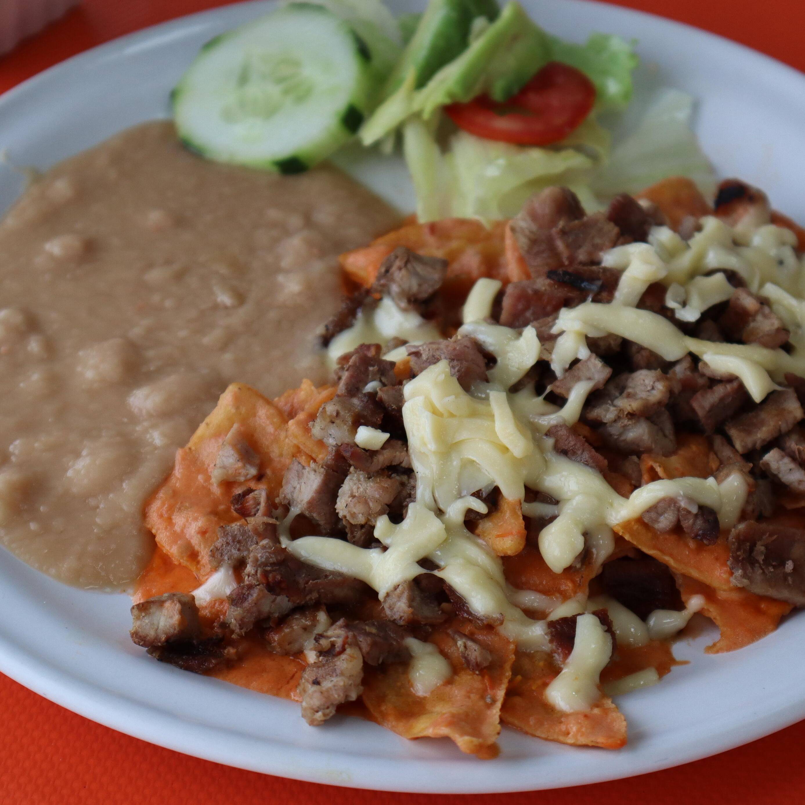 Nachos con queso amarillo , queso seco ,pierna de cerdo, frijoles y chile jalapeño