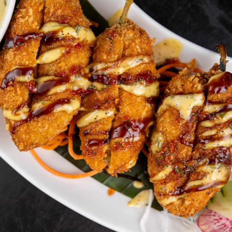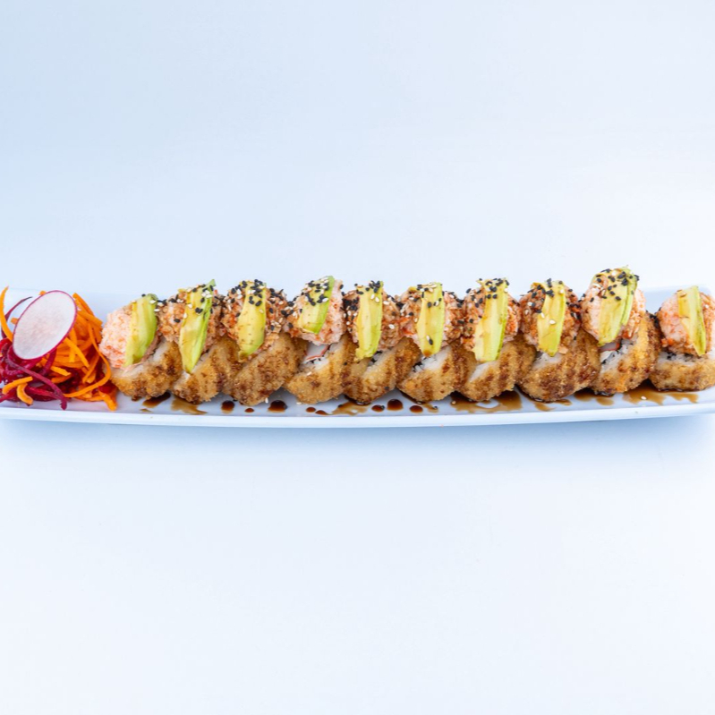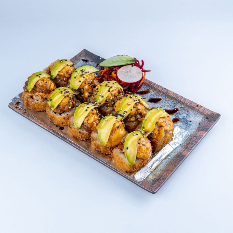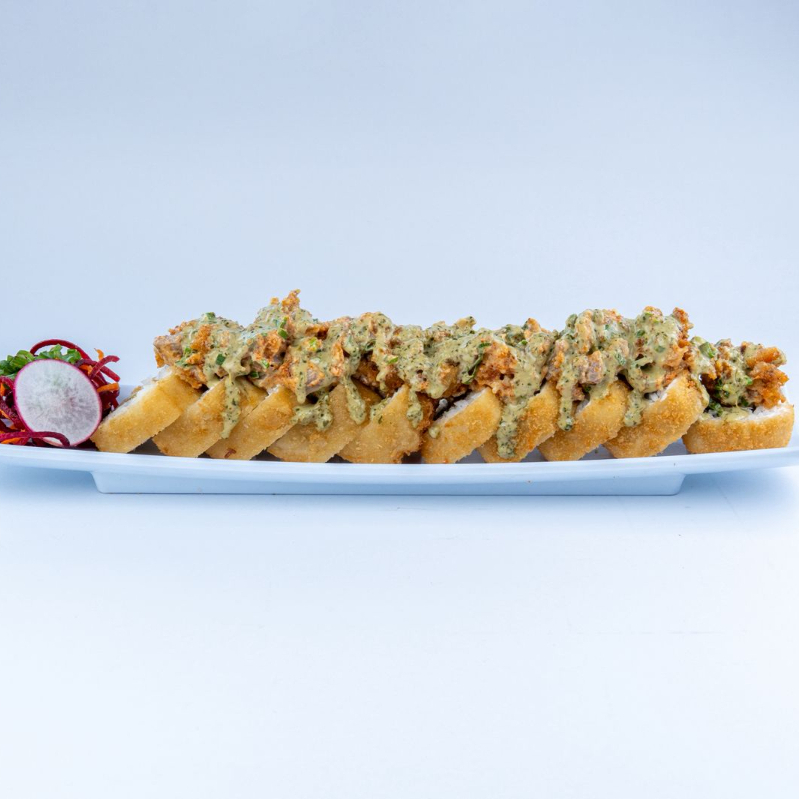 Rollo empanizado cubierto de queso philadelphia relleno pollo a elección con aguacate, queso manchego y cebollitas toreadas, con topping de trozos de pechuga de pollo empanizada con aderezo picosito de la casa y mayo-cilantro.