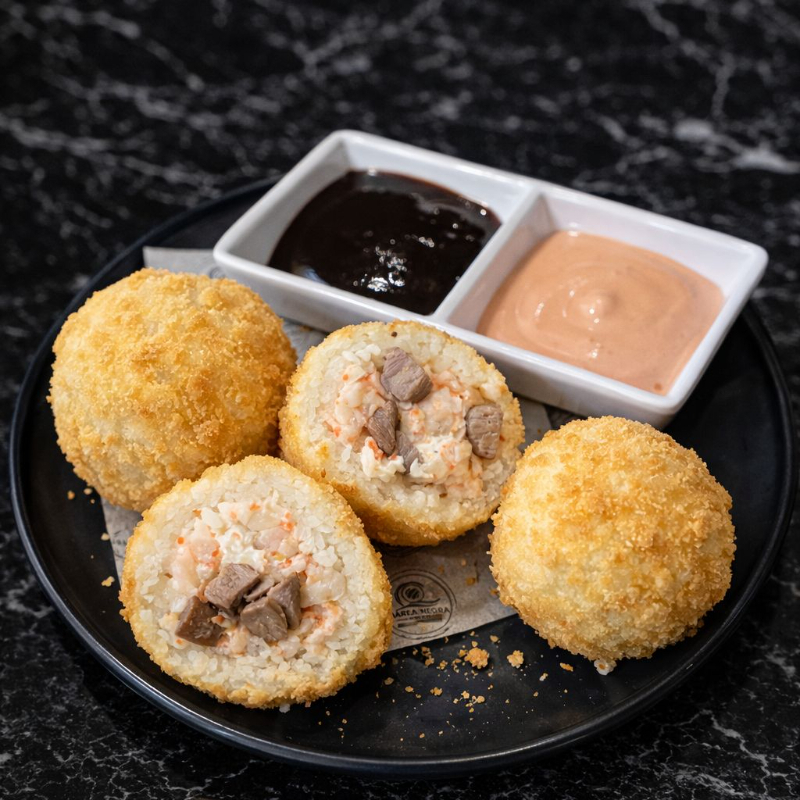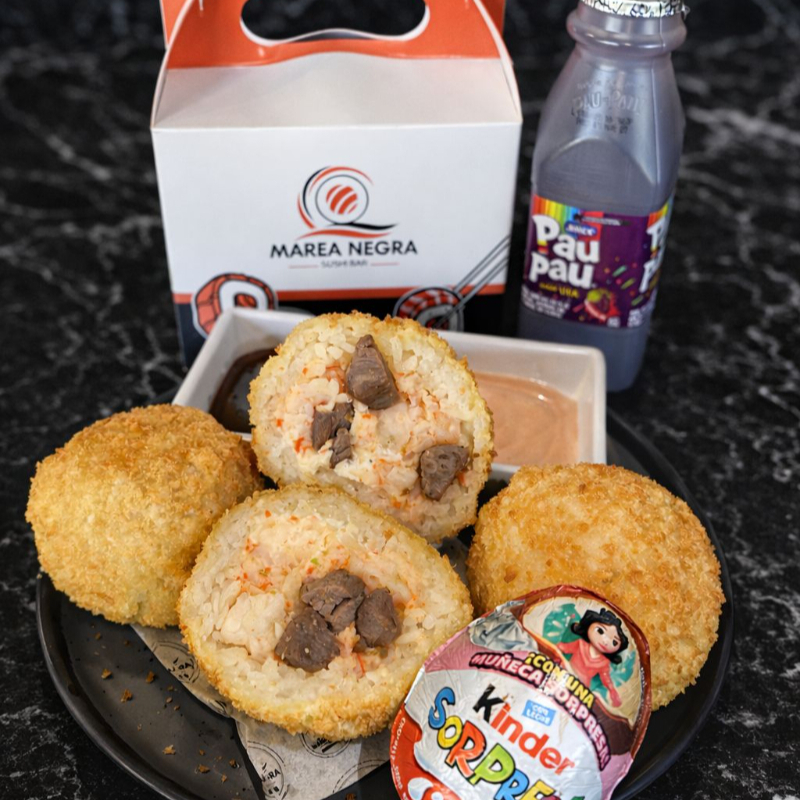 BOLAS DE ARROZ RELLENAS DE TAMPICO,QUESO PHILADELPHIA Y RES,ACOMPAÑADO DE JUGO Y HUEVO KINDER