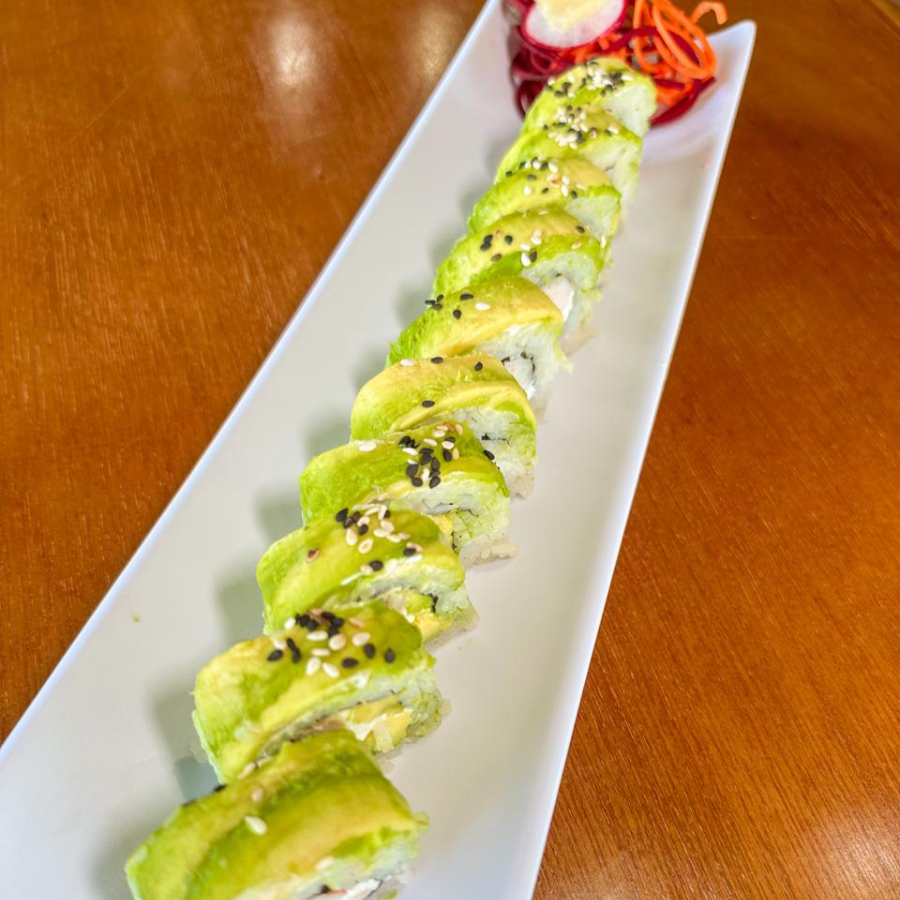 Por fuera forrado en aguacate, por dentro camarón, pepino, aguacate y queso.