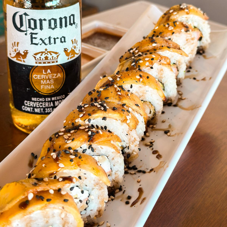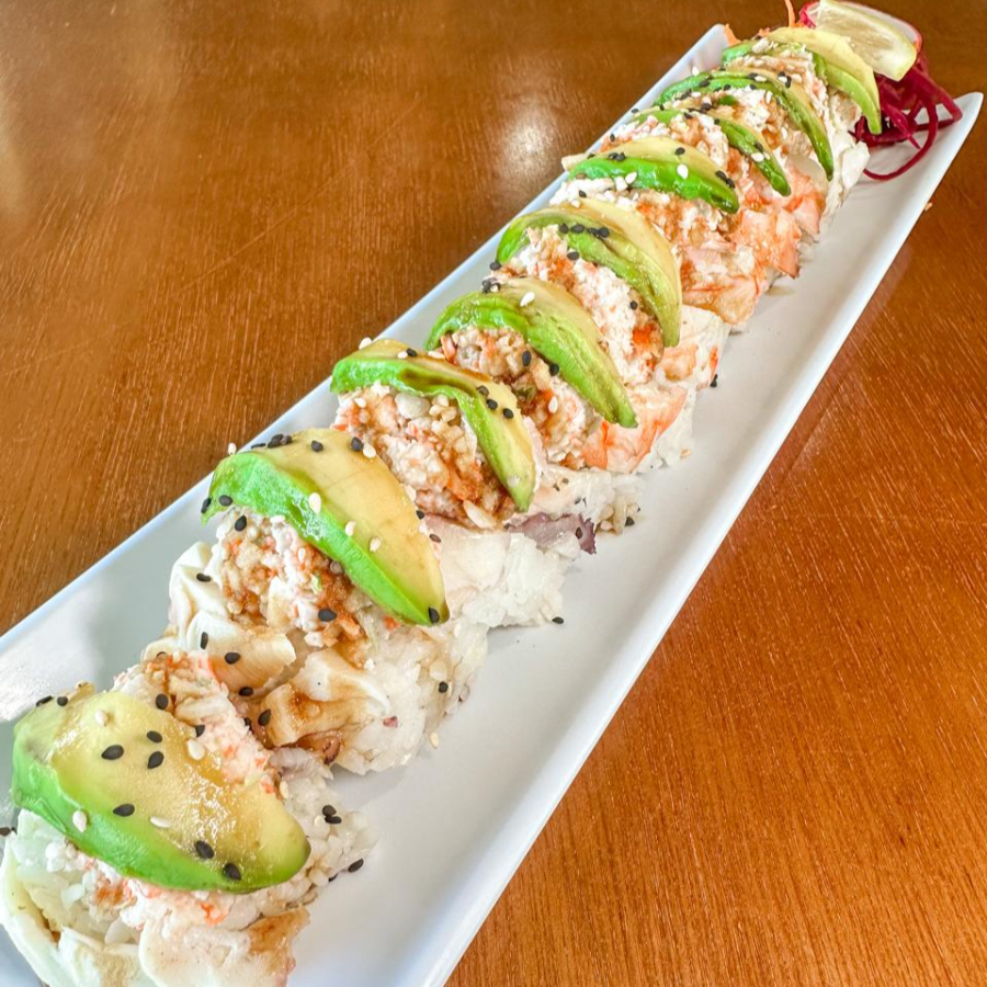 Rollo horneado gratinado con aderezo de la casa y queso manchego relleno de camarón, queso philadelphia y aguacate, con topping de camarón con tocino y carne, con laminas de aguacate encima y bañado en salsa de anguila y ajonjolí.